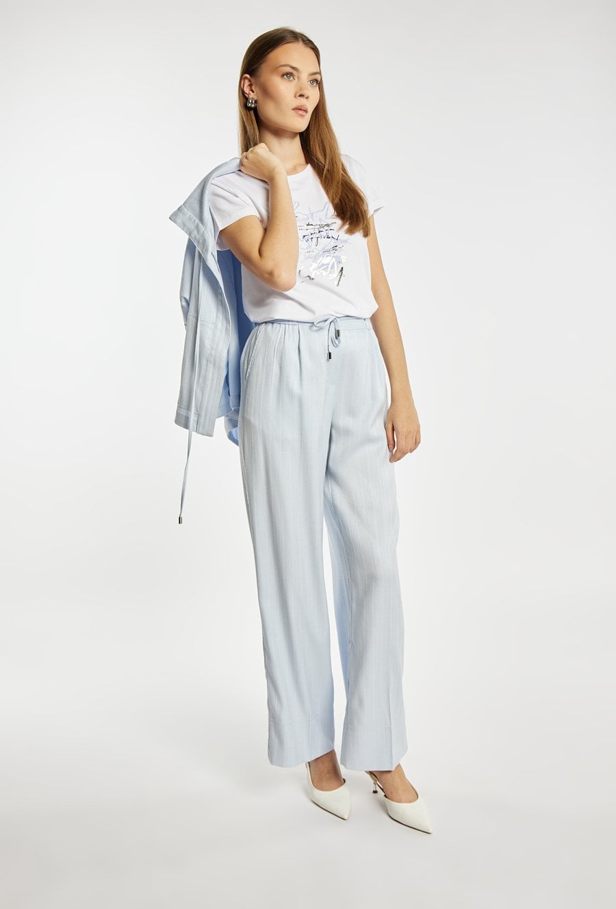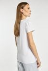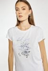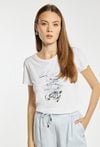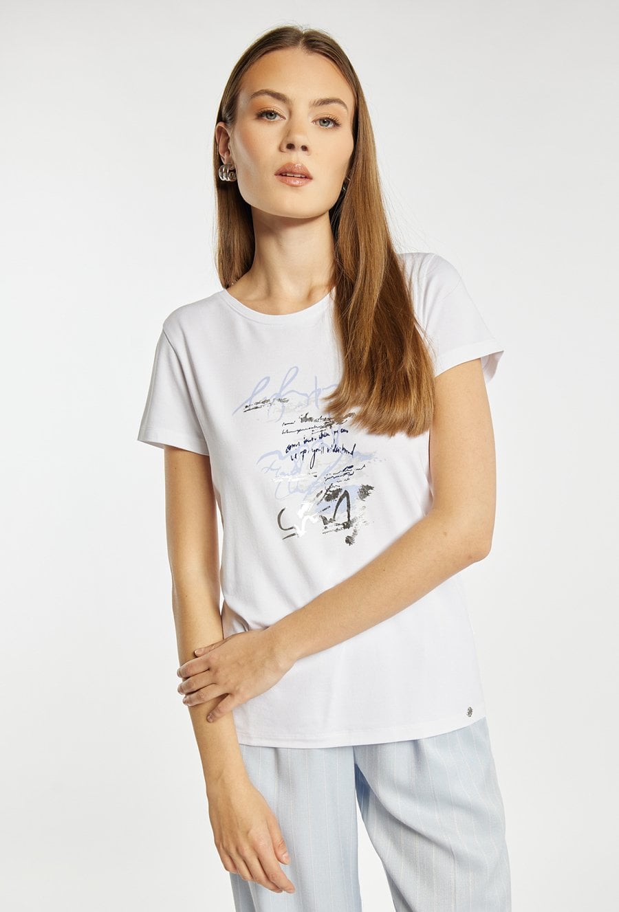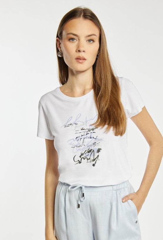 T-shirt damski o prostym, wygodnym fasonie z krótkim rękawem. Model z klasycznym, półokrągłym dekoltem. Z przodu znajduje się subtelny nadruk o artystycznym charakterze. T-shirt idealna do codziennych stylizacji. Modelka na zdjęciu ma 177 cm wzrostu i prezentuje rozmiar S.
