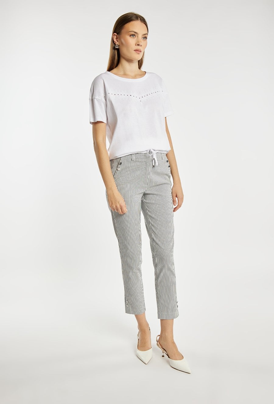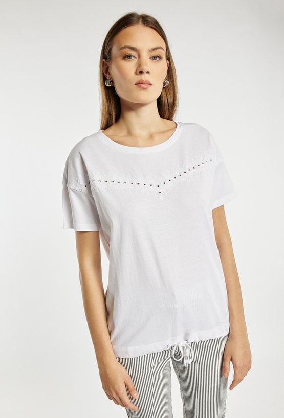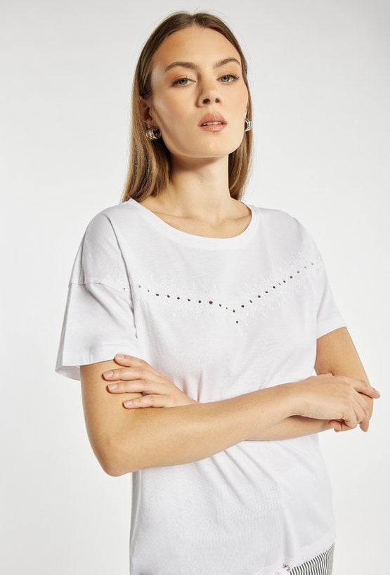 T-shirt damski o luźnym, komfortowym kroju z krótkim rękawem. Model z klasycznym, półokrągłym dekoltem. Z przodu znajduje się subtelne, ażurowe zdobienie w kształcie litery V, które dodaje całości lekkości i kobiecego uroku. T-shirt idealny do codziennych stylizacji. Modelka na zdjęciu ma 177 cm wzrostu i prezentuje rozmiar S.