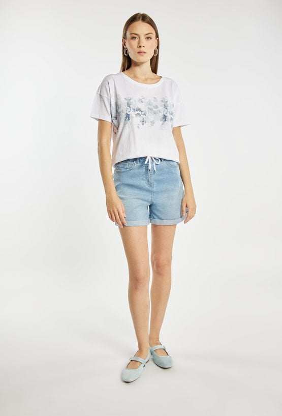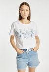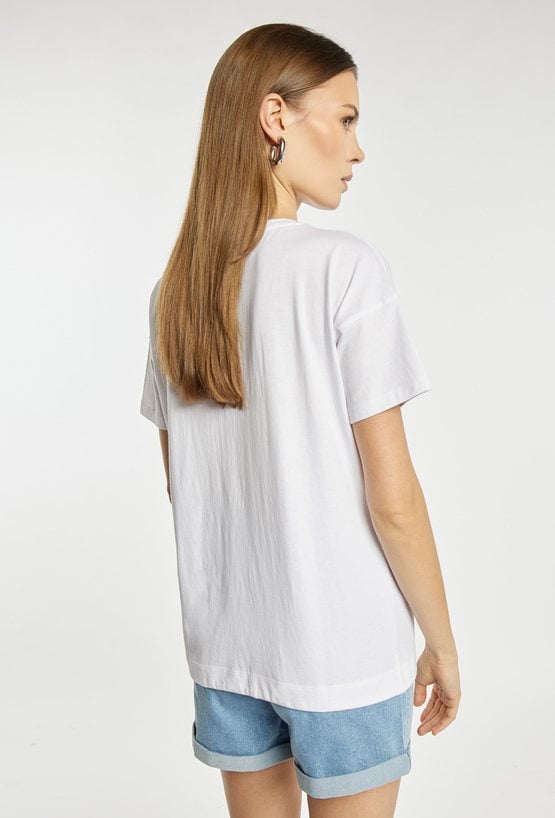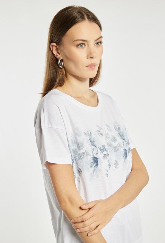 T-shirt damski o luźnym, komfortowym kroju z krótkim rękawem i klasycznym, półokrągłym dekoltem. Z przodu znajduje się subtelny nadruk z motywem roślinnym w delikatnej odsłonie. T-shirt przyjemny w dotyku materiał zapewnia wygodę noszenia na co dzień. Modelka na zdjęciu ma 177 cm wzrostu i prezentuje rozmiar S.