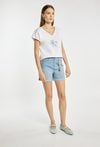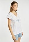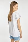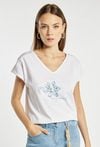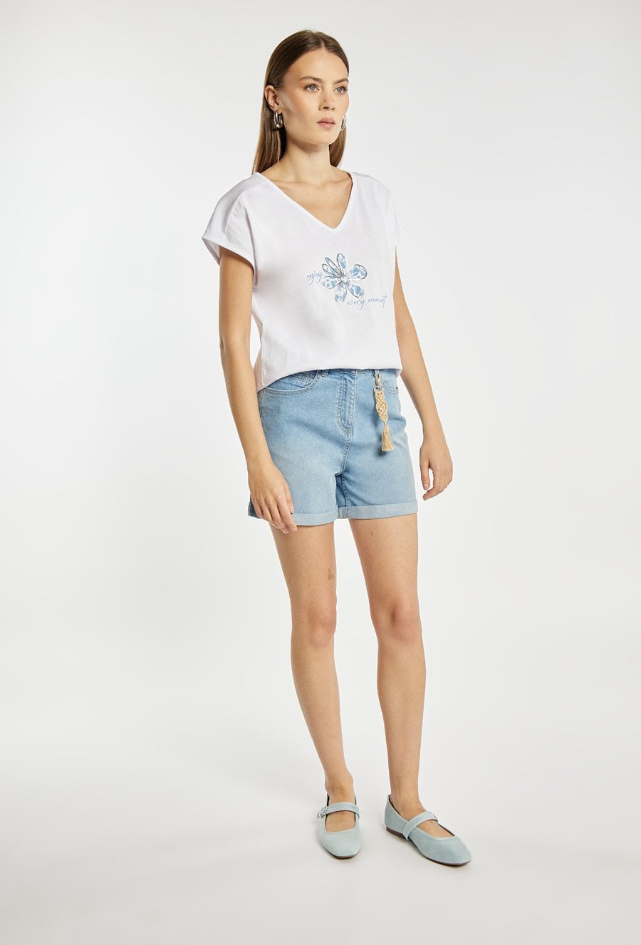 T-shirt damski o luźnym, wygodnym fasonie z krótkim rękawem i dekoltem w kształcie litery V. Z przodu znajduje się subtelny nadruk z motywem kwiatowym i delikatnym napisem, który dodaje całości lekkości i kobiecego charakteru. Modelka na zdjęciu ma 177 cm wzrostu i prezentuje rozmiar S.