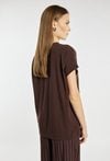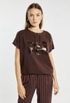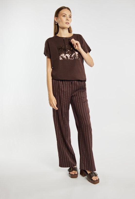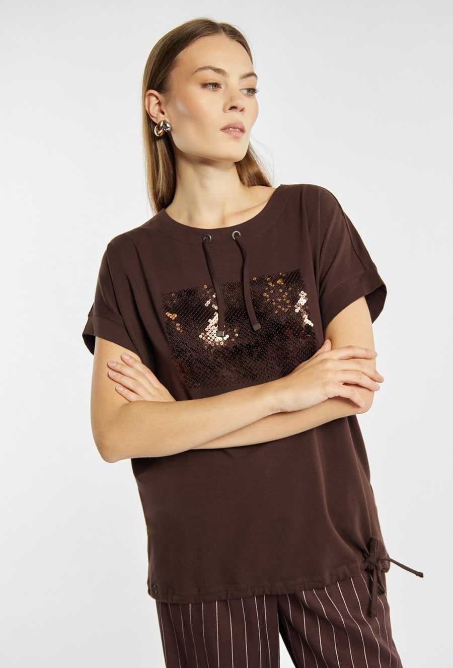 T-shirt damski o luźnym, wygodnym fasonie z krótkim rękawem i półokrągłym dekoltem z ozdobnymi troczkami. Z przodu znajduje się efektowna aplikacja z cekinów, która nadaje całości modnego, przyciągającego uwagę charakteru. T-shirt idealny do codziennych i bardziej stylowych stylizacji. Modelka na zdjęciu ma 177 cm wzrostu i prezentuje rozmiar S.