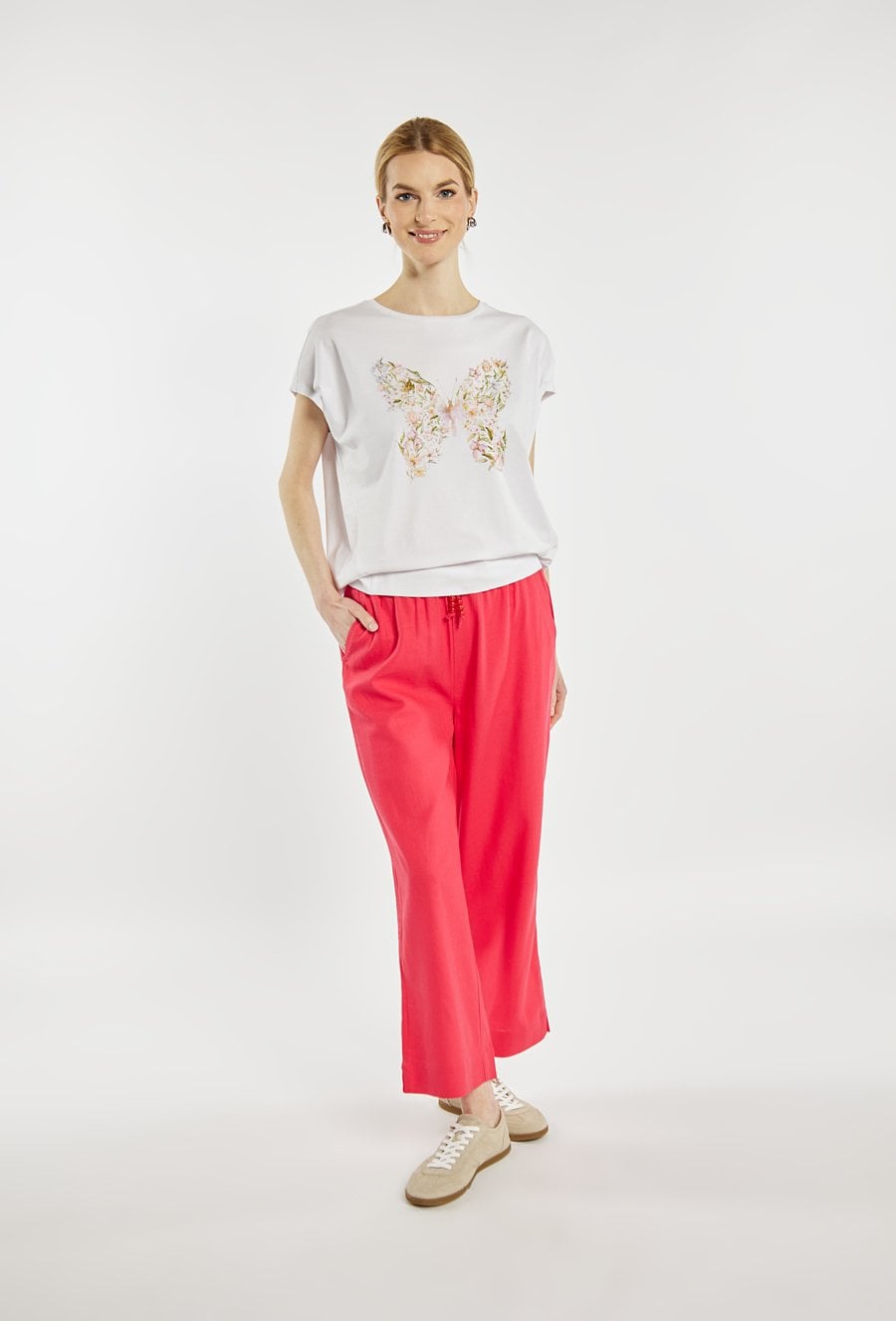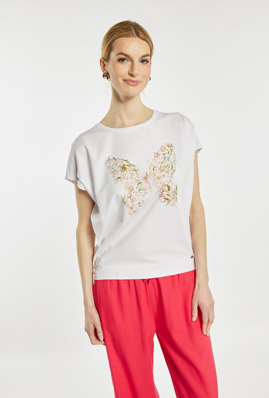 T-shirt damski o luźnym, swobodnym kroju z krótkim rękawem i klasycznym, półokrągłym dekoltem. Z przodu znajduje się subtelny nadruk z motywem roślinnym układającym się w kształt motyla, który dodaje stylizacji lekkości i kobiecego charakteru. T-shirt idealny do codziennych stylizacji. Modelka na zdjęciu ma 177 cm wzrostu i prezentuje rozmiar S.