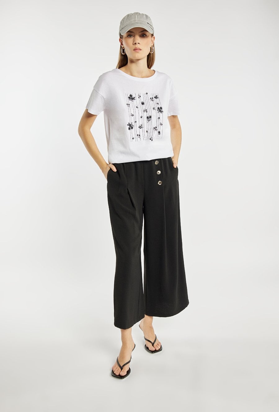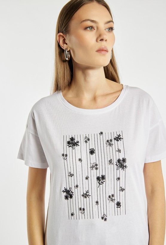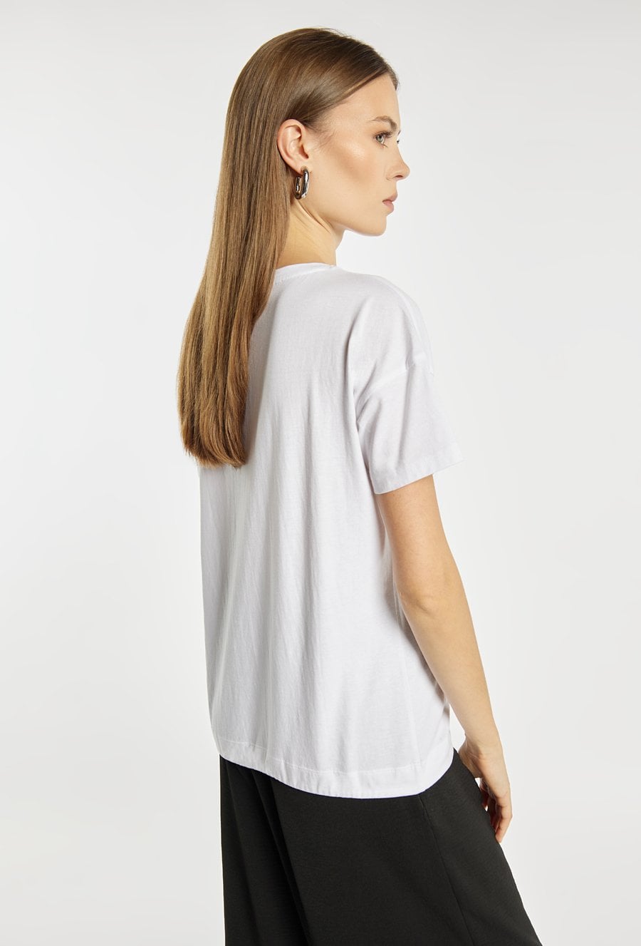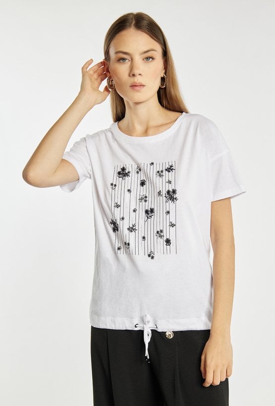 T-shirt damski o luźnym, komfortowym kroju z krótkim rękawem. Model z klasycznym, półokrągłym dekoltem. Z przodu znajduje się subtelny nadruk o nowoczesnym charakterze, stanowiący stylowy akcent. Dół wykończony wiązaniem pozwala na lekkie dopasowanie fasonu. Modelka na zdjęciu ma 177 cm wzrostu i prezentuje rozmiar S.