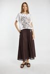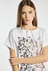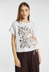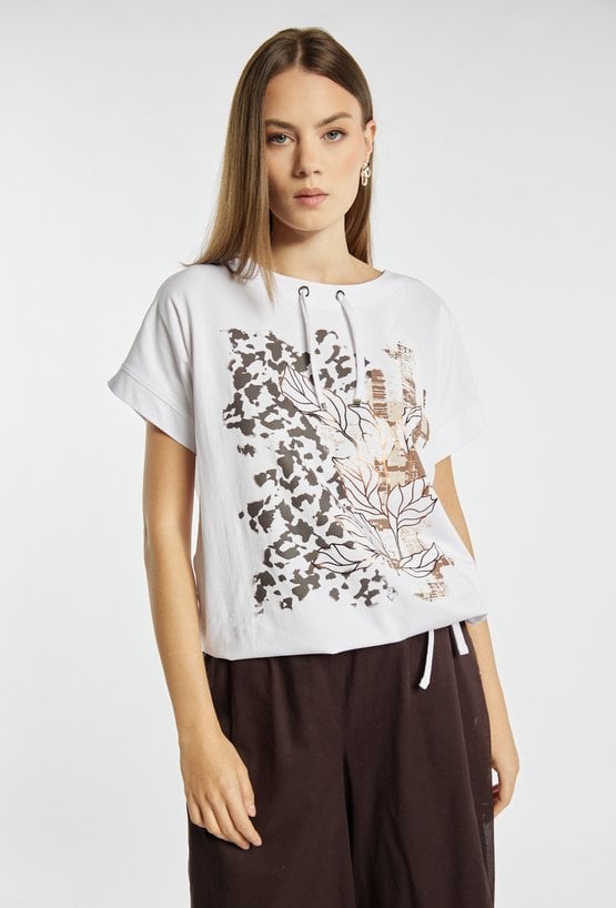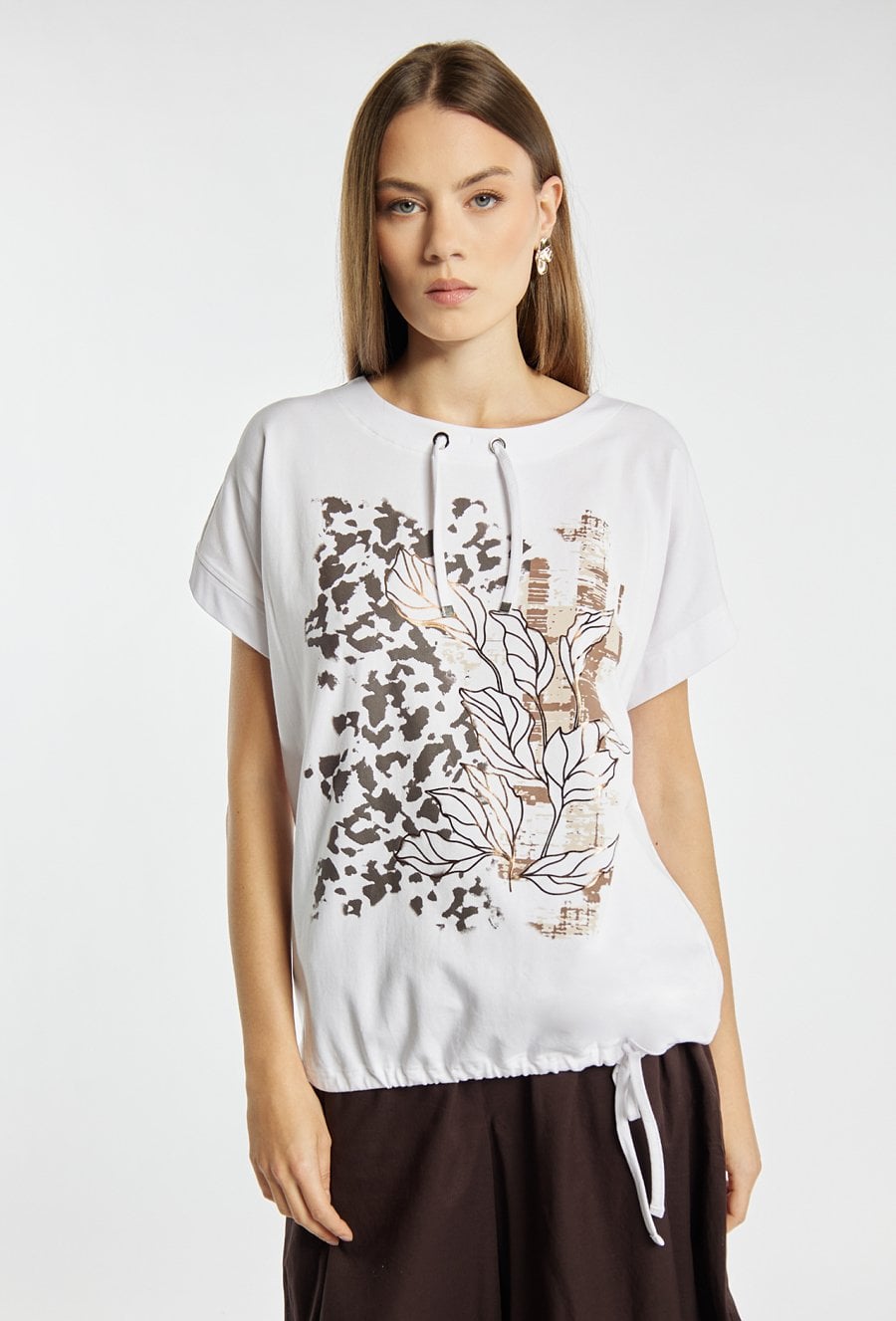 T-shirt damski o luźnym, komfortowym kroju z krótkim rękawem i półokrągłym dekoltem z ozdobnymi troczkami. Z przodu znajduje się efektowny nadruk łączący motyw roślinny z nowoczesną grafiką. Dół wykończony ściągaczem z wiązaniem pozwala na dopasowanie fasonu. Modelka na zdjęciu ma 177 cm wzrostu i prezentuje rozmiar S.