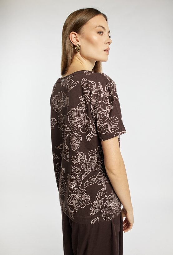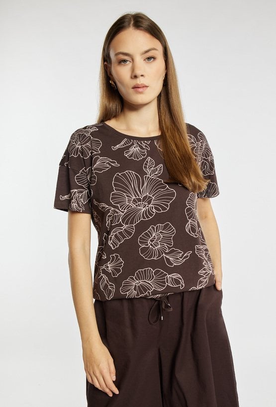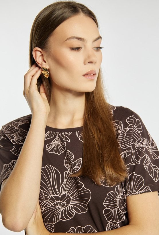 T-shirt damski o wygodnym, prostym kroju z krótkim rękawem i klasycznym, półokrągłym dekoltem. Całość pokryta efektownym wzorem z motywem roślinnym, który nadaje stylizacji wyrazistego charakteru. T-shirt idealny na co dzień. Modelka na zdjęciu ma 177 cm wzrostu i prezentuje rozmiar S.