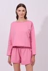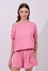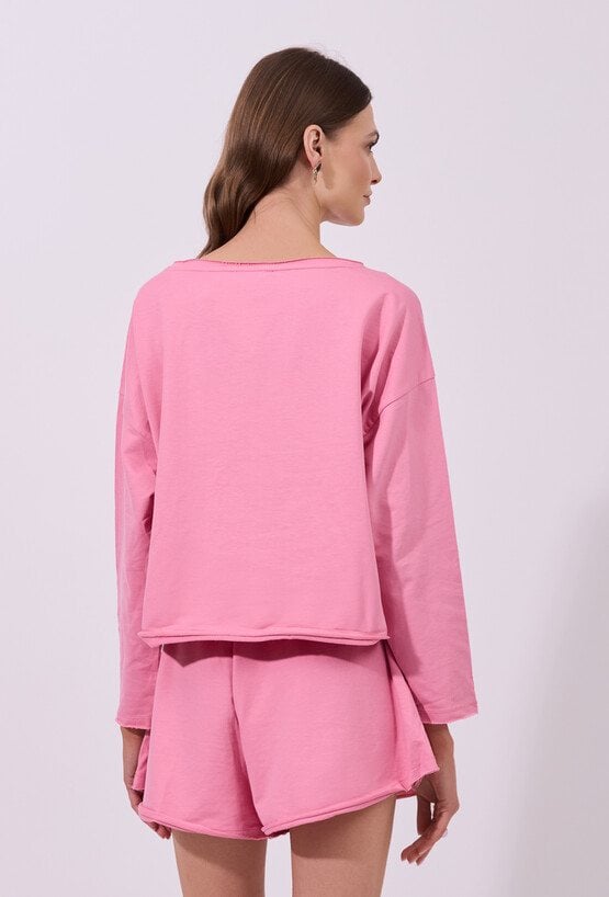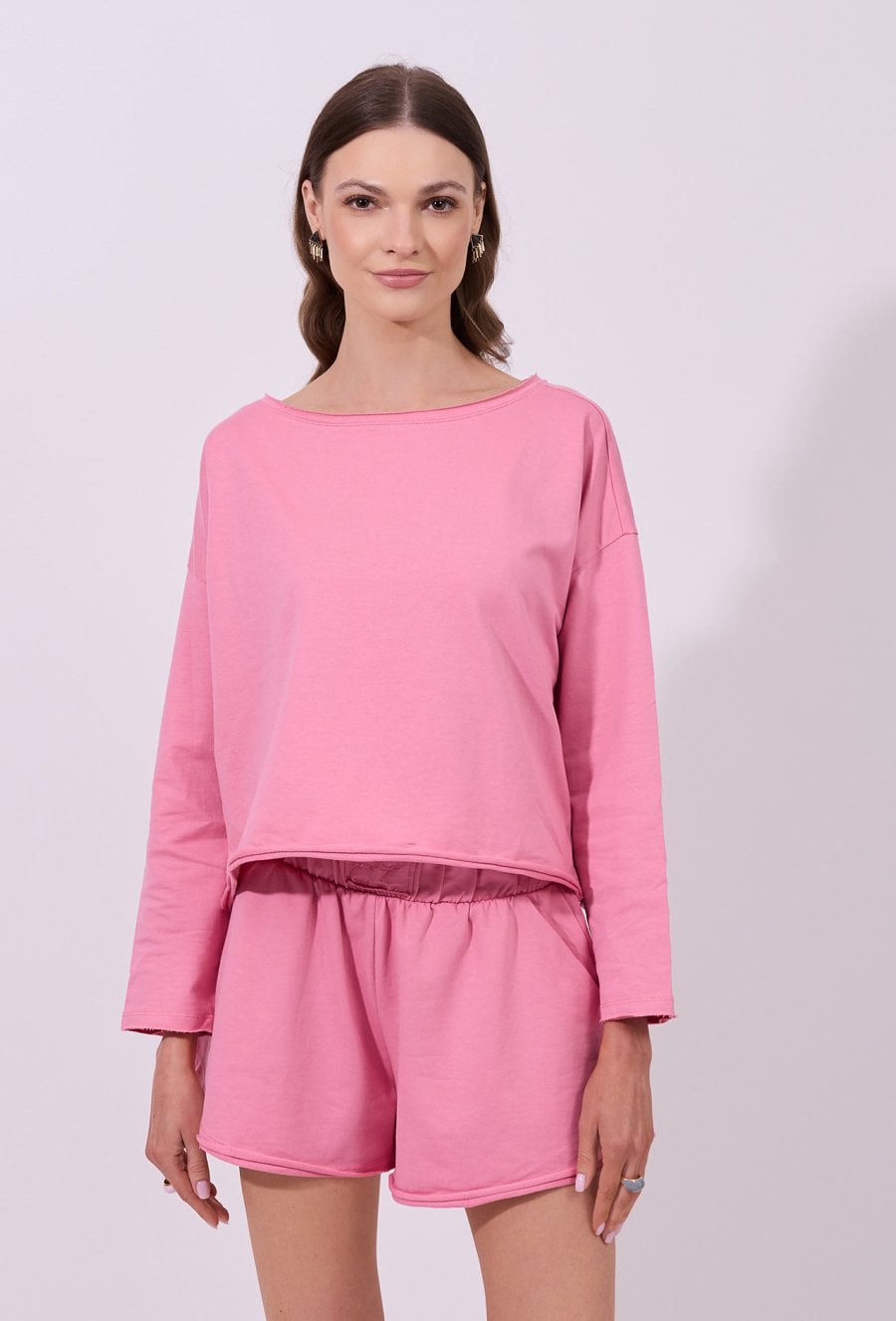 Bluza damska o luźnym, swobodnym kroju z długim rękawem. Model z szerokim, półokrągłym dekoltem, który nadaje całości casualowego charakteru. Krótszy fason podkreśla nowoczesny styl. Idealna do codziennych, wygodnych stylizacji. Modelka na zdjęciu ma 177 cm wzrostu i prezentuje rozmiar S.