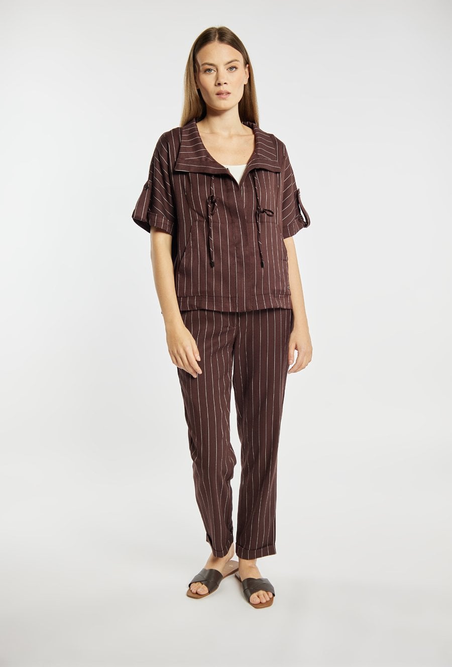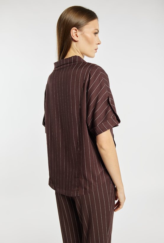 Bluza damska o luźnym, swobodnym kroju z krótkim rękawem. Model z szerokim kołnierzem i dekoltem w kształcie litery V, który nadaje całości nowoczesnego, casualowego charakteru. Rękawy z możliwością podpięcia dodają funkcjonalności. Całość zdobi delikatny, pionowy prążek, który optycznie wysmukla sylwetkę. Idealna do codziennych, komfortowych stylizacji. Modelka na zdjęciu ma 177 cm wzrostu i prezentuje rozmiar 36.