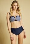 Stylowy stanik kąpielowy typu bandeau w modny, paskowany wzór. Model z ozdobnym detalem z przodu, który podkreśla biust i nadaje całości wyjątkowego charakteru. Stanik posiada odpinane ramiączka, dzięki czemu można nosić go na różne sposoby, zapewniając wygodę i idealne dopasowanie. Polecamy uzupełnić swoją stylizację o stanik kąpielowy z tym samym wzorem, tworząc spójny i modny komplet plażowy. Kod do majtek: 26L-PAN0060. Modelka na zdjęciu prezentuje rozmiar 36.