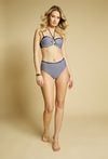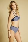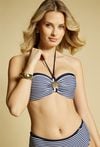 Stylowy stanik kąpielowy typu bandeau w modny, paskowany wzór. Model z regulowanymi ramiączkami oraz ozdobnym detalem z przodu, który nadaje całości wyjątkowego charakteru. Stanik zapewnia wygodę i dobre dopasowanie, doskonale sprawdzając się w letnich stylizacjach plażowych.