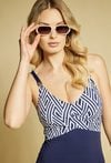 Strój kąpielowy jednoczęściowy z efektownym wzorem w górnej części. Model na ramiączkach z dekoltem w kształcie litery V, który podkreśla sylwetkę i zapewnia wygodę noszenia. Strój doskonale sprawdzi się w modnych stylizacjach plażowych oraz podczas wakacyjnych wyjazdów. Modelka na zdjęciu prezentuje rozmiar 36