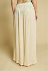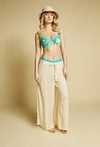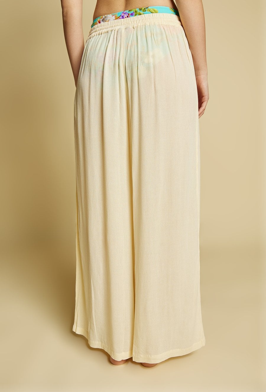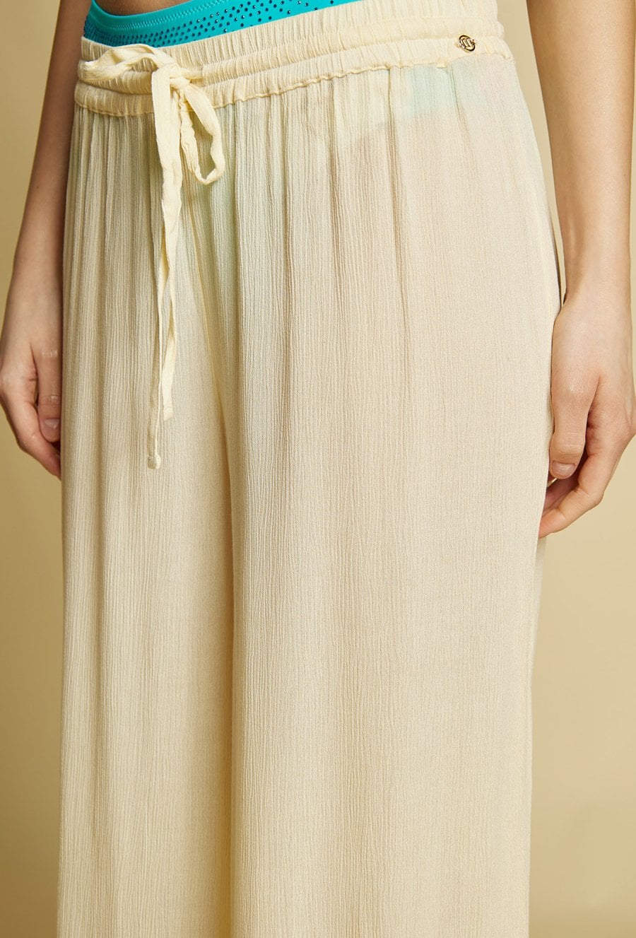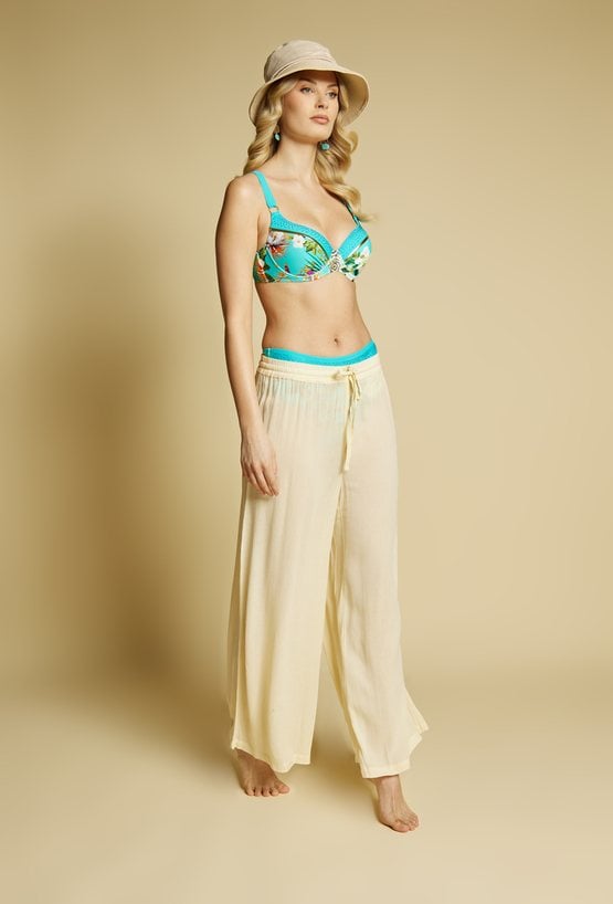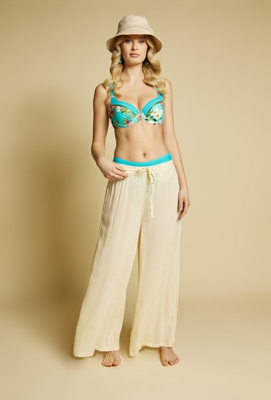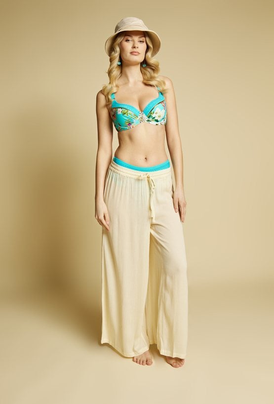 Lekkie spodnie damskie o luźnym kroju, idealne na plażę. Model z szeroką nogawką i elastycznym pasem z wiązaniem zapewnia wygodę i swobodę noszenia.