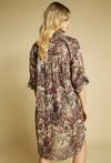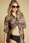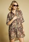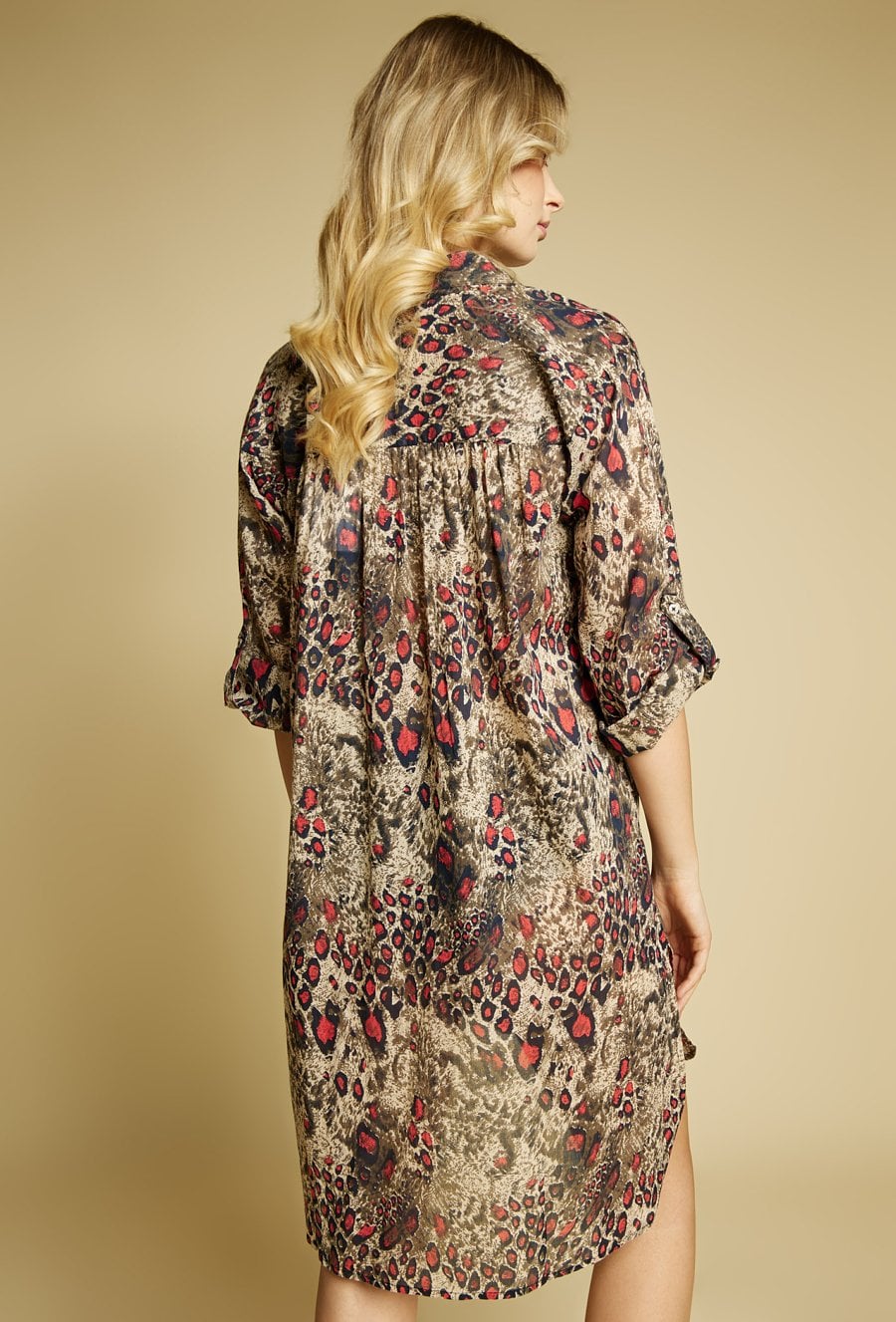 Pareo damskie w formie lekkiej, zwiewnej koszuli o wydłużonym kroju. Model zapinany na guziki, z klasycznym kołnierzykiem oraz rękawem 3/4 z możliwością podpięcia. Całość zdobi wyrazisty, zwierzęcy wzór, który nadaje stylizacji charakteru i modowego wyrazu. Modelka na zdjęciu ma 177 cm wzrostu i prezentuje rozmiar S/M.