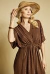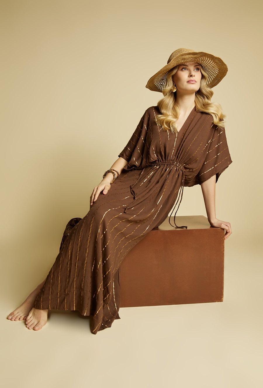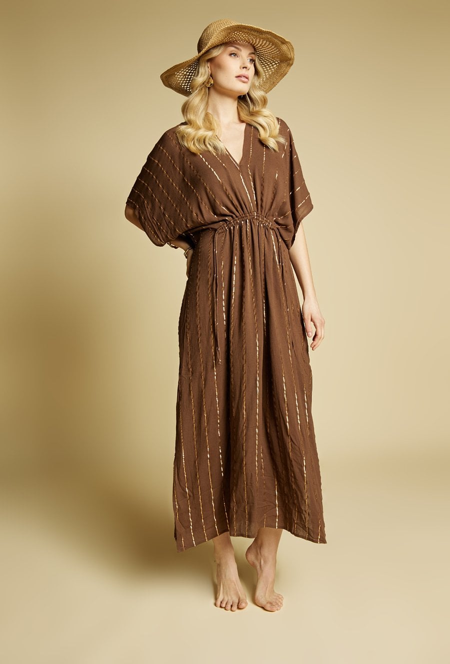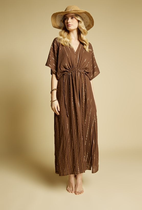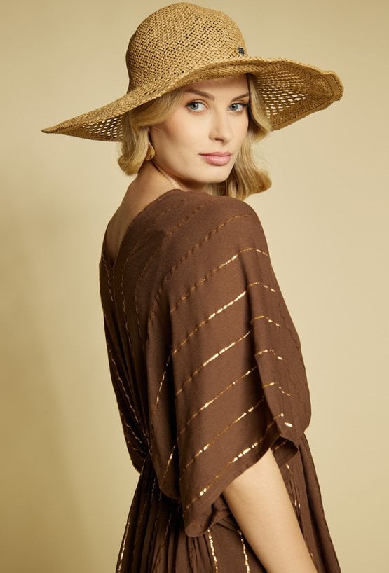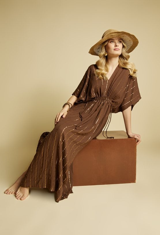 Pareo damskie w formie długiej, zwiewnej sukienki maxi o luźnym kroju. Model z dekoltem w kształcie litery V oraz szerokimi, kimono rękawami, które nadają całości lekkiego, wakacyjnego charakteru. Idealnie sprawdzi się jako stylowa narzutka plażowa.