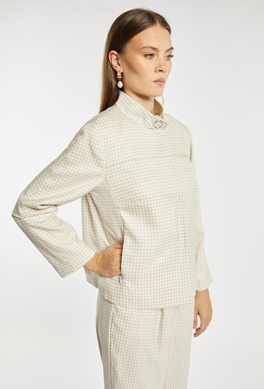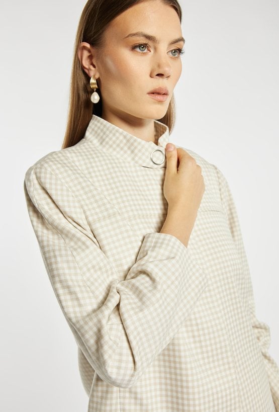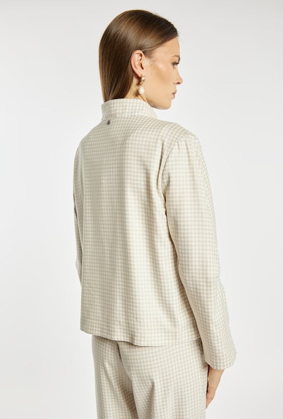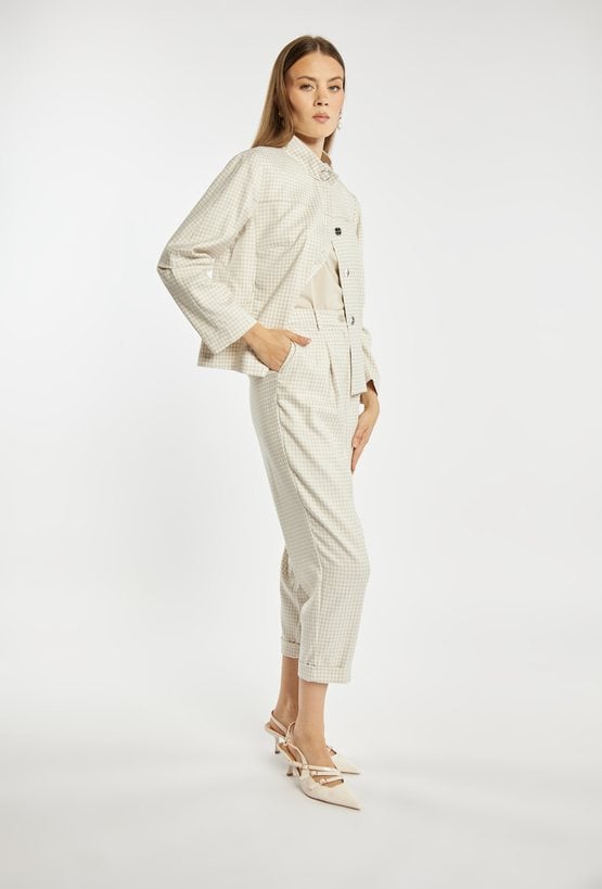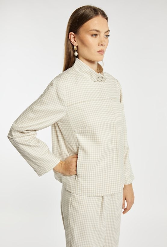 Kurtka damska o krótkim, swobodnym kroju z długim rękawem. Model z klasycznym kołnierzykiem oraz zapięciem z przodu, który nadaje całości stylowego, casualowego charakteru. Całość zdobi ponadczasowy wzór w drobną kratkę, dodający elegancji i modowego wyrazu. Idealna do codziennych stylizacji, łącząc wygodę z klasycznym stylem. Modelka na zdjęciu ma 177 cm wzrostu i prezentuje rozmiar 36.