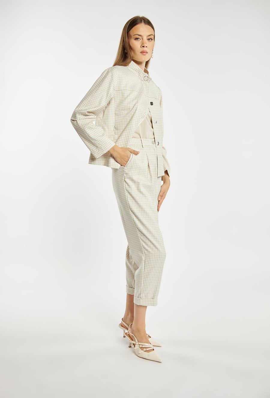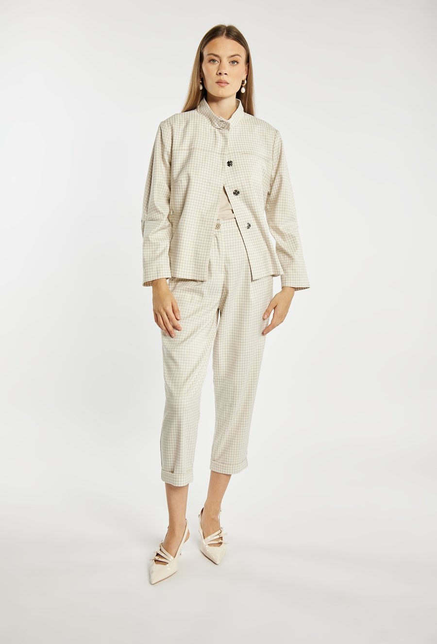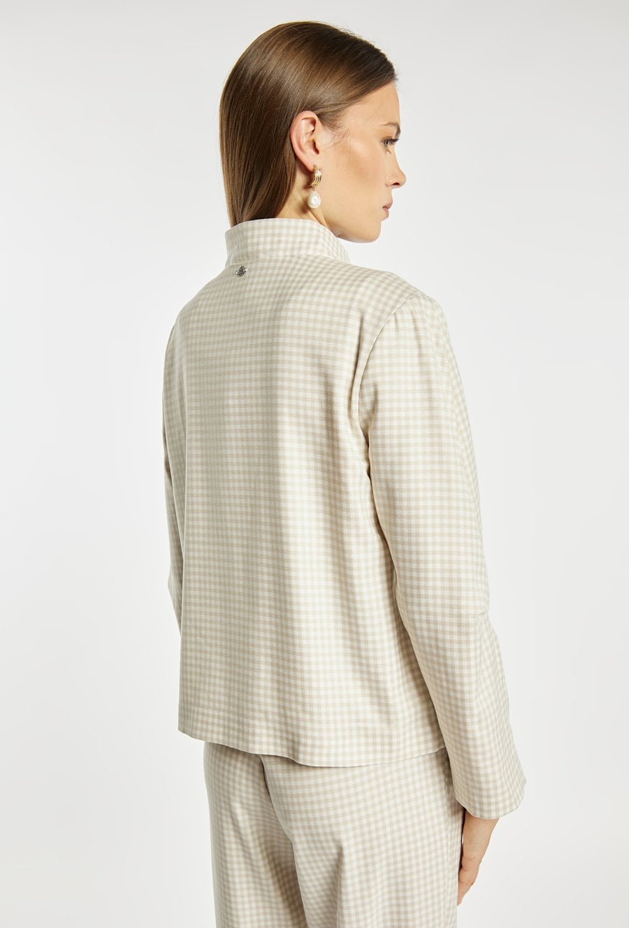 Kurtka damska o krótkim, swobodnym kroju z długim rękawem. Model z klasycznym kołnierzykiem oraz zapięciem z przodu, który nadaje całości stylowego, casualowego charakteru. Całość zdobi ponadczasowy wzór w drobną kratkę, dodający elegancji i modowego wyrazu. Idealna do codziennych stylizacji, łącząc wygodę z klasycznym stylem. Modelka na zdjęciu ma 177 cm wzrostu i prezentuje rozmiar 36.