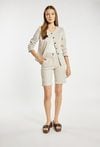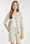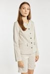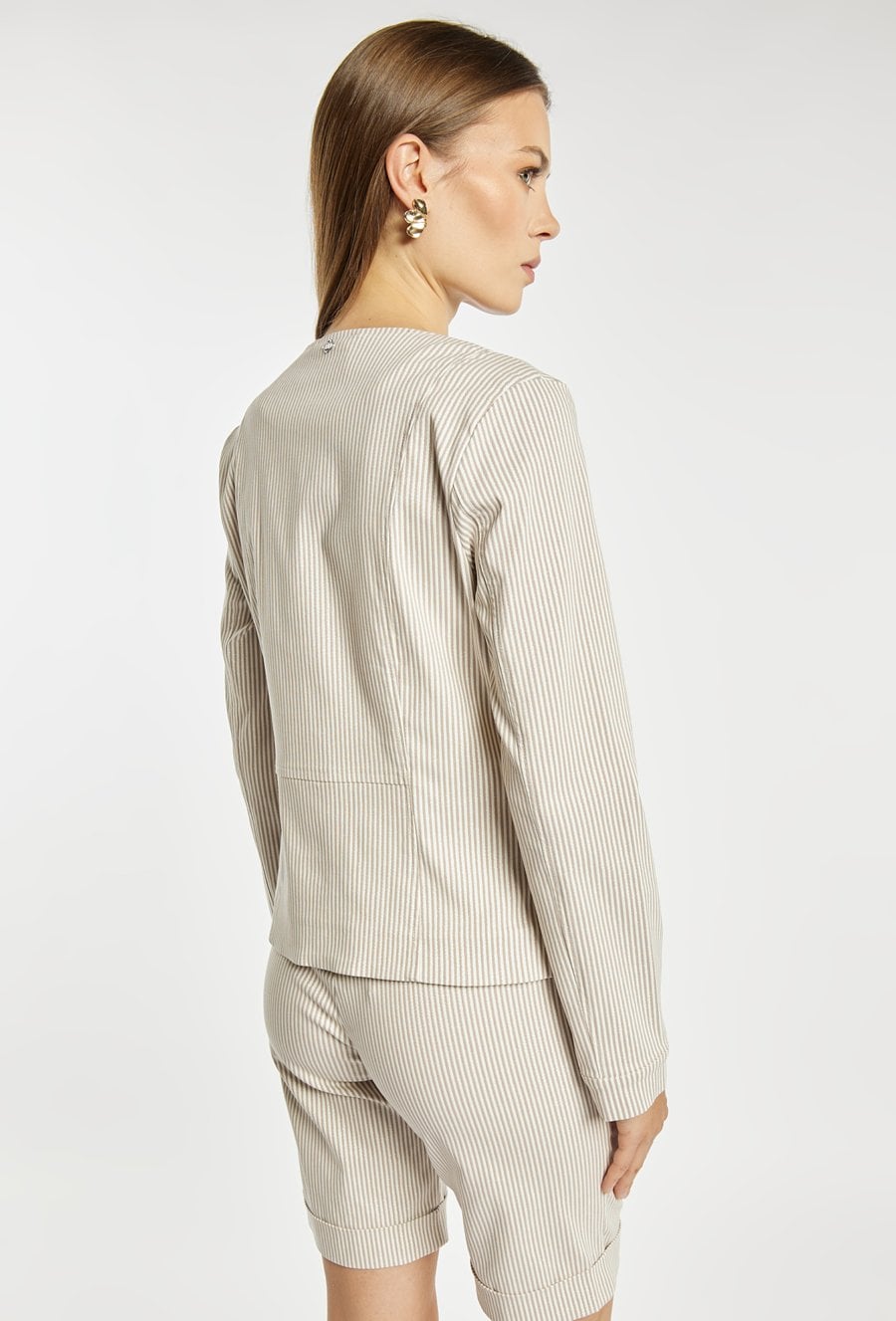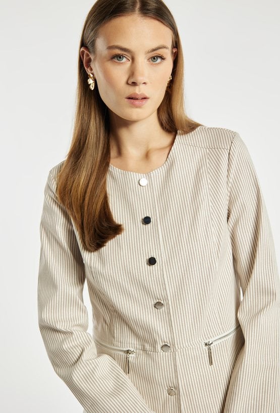 Kurtka damska o dopasowanym, eleganckim kroju z długim rękawem. Model zapinany na guziki, z dekoltem w kształcie litery V, który nadaje całości subtelnie kobiecego charakteru. Delikatny, pionowy prążek optycznie wysmukla sylwetkę i dodaje stylizacji lekkości. Modelka na zdjęciu ma 177 cm wzrostu i prezentuje rozmiar 36.