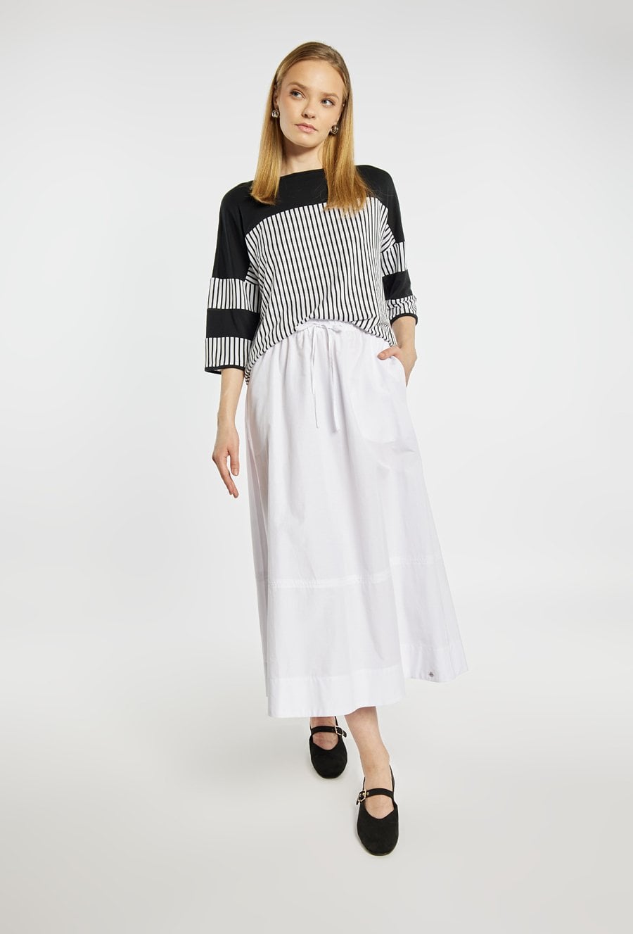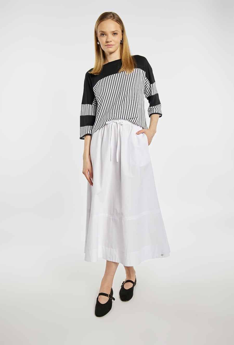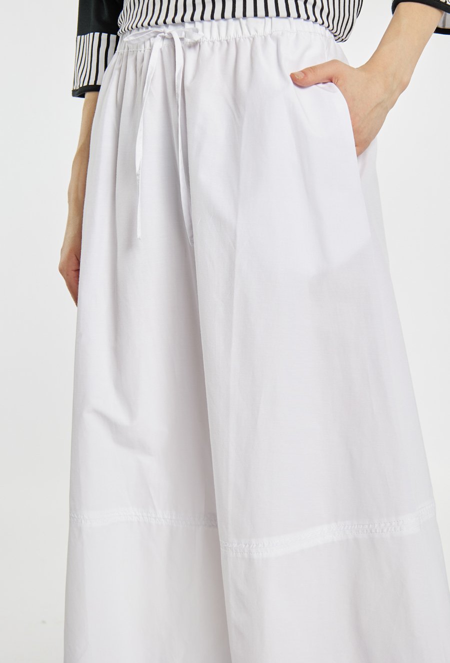 Spódnica midi o swobodnym, rozkloszowanym fasonie. Model z elastyczną talią oraz regulowanym wiązaniem, zapewniającym komfort noszenia. Idealna do codziennych i letnich stylizacji. Modelka na zdjęciu ma 177 cm wzrostu i prezentuje rozmiar 36.