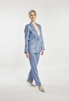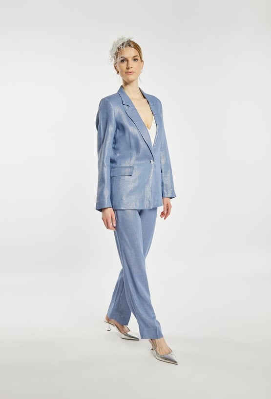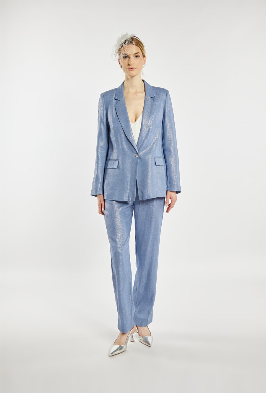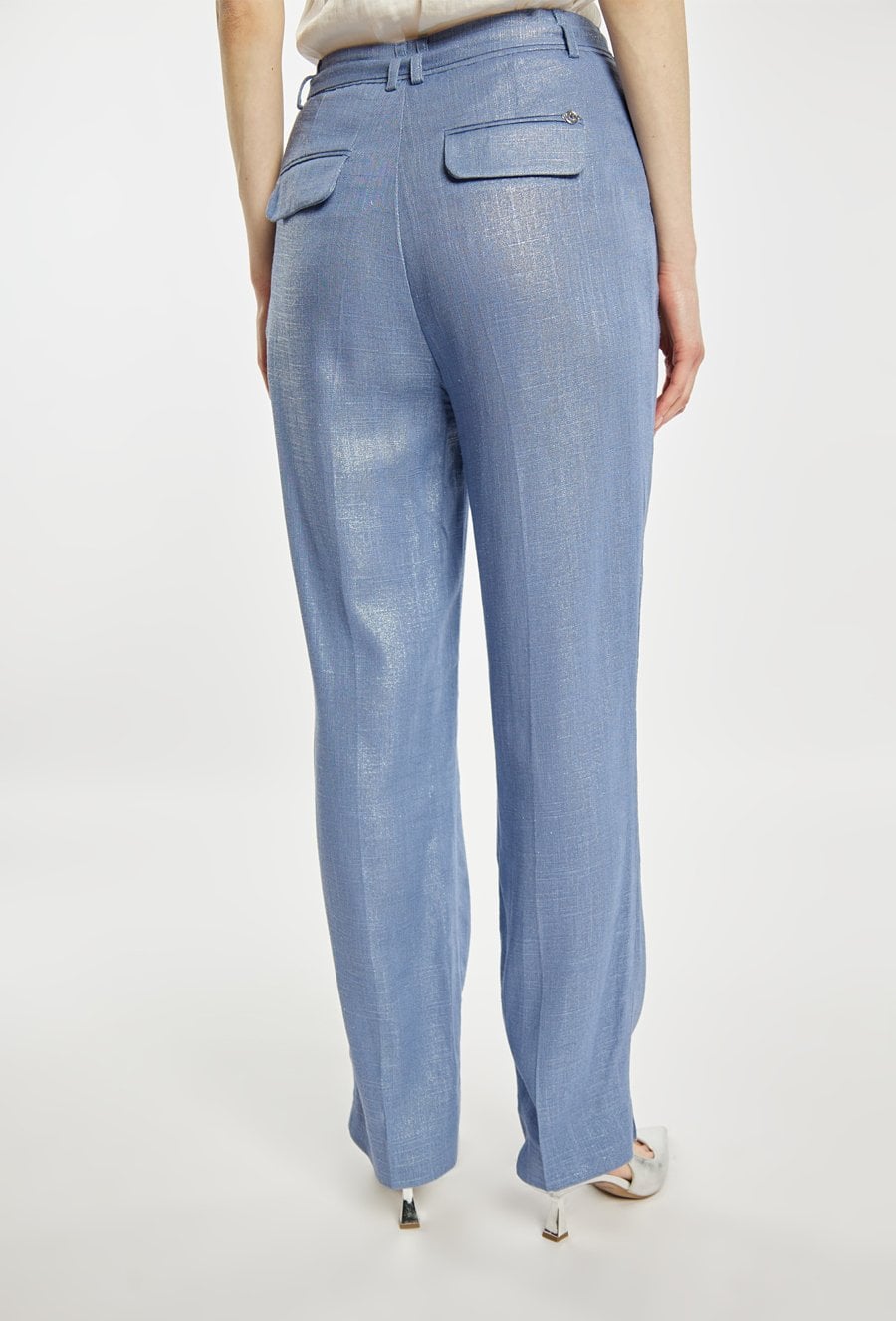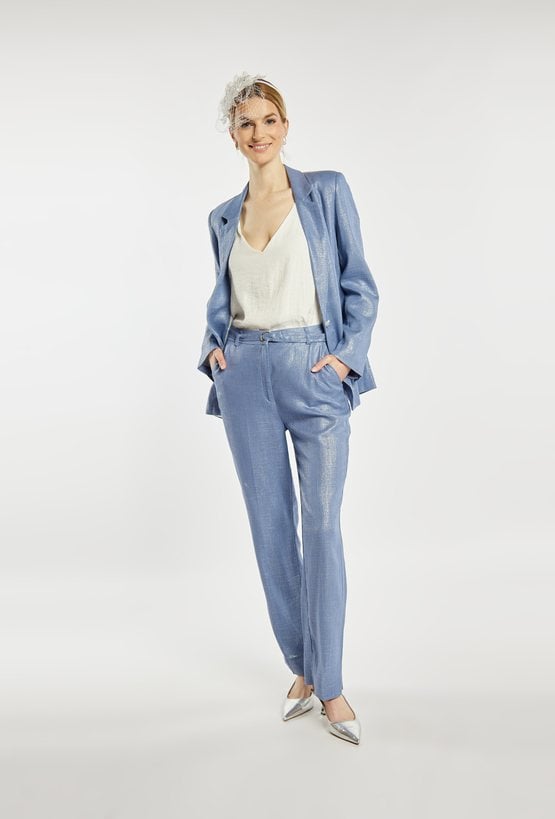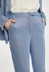 Spodnie damskie o eleganckim, prostym kroju z lekko zwężaną nogawką. Model z wysokim stanem, zapinany oraz uzupełniony paskiem w zestawie, który podkreśla talię. Klasyczny fason sprawia, że spodnie świetnie układają się na sylwetce. Można je zestawić z pasującą marynarką, tworząc stylowy komplet. Kod od marynarki: 26L-BZR0430. Modelka na zdjęciu ma 177 cm wzrostu i prezentuje rozmiar 36.