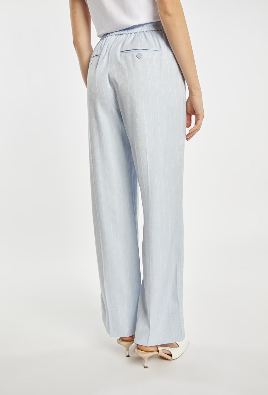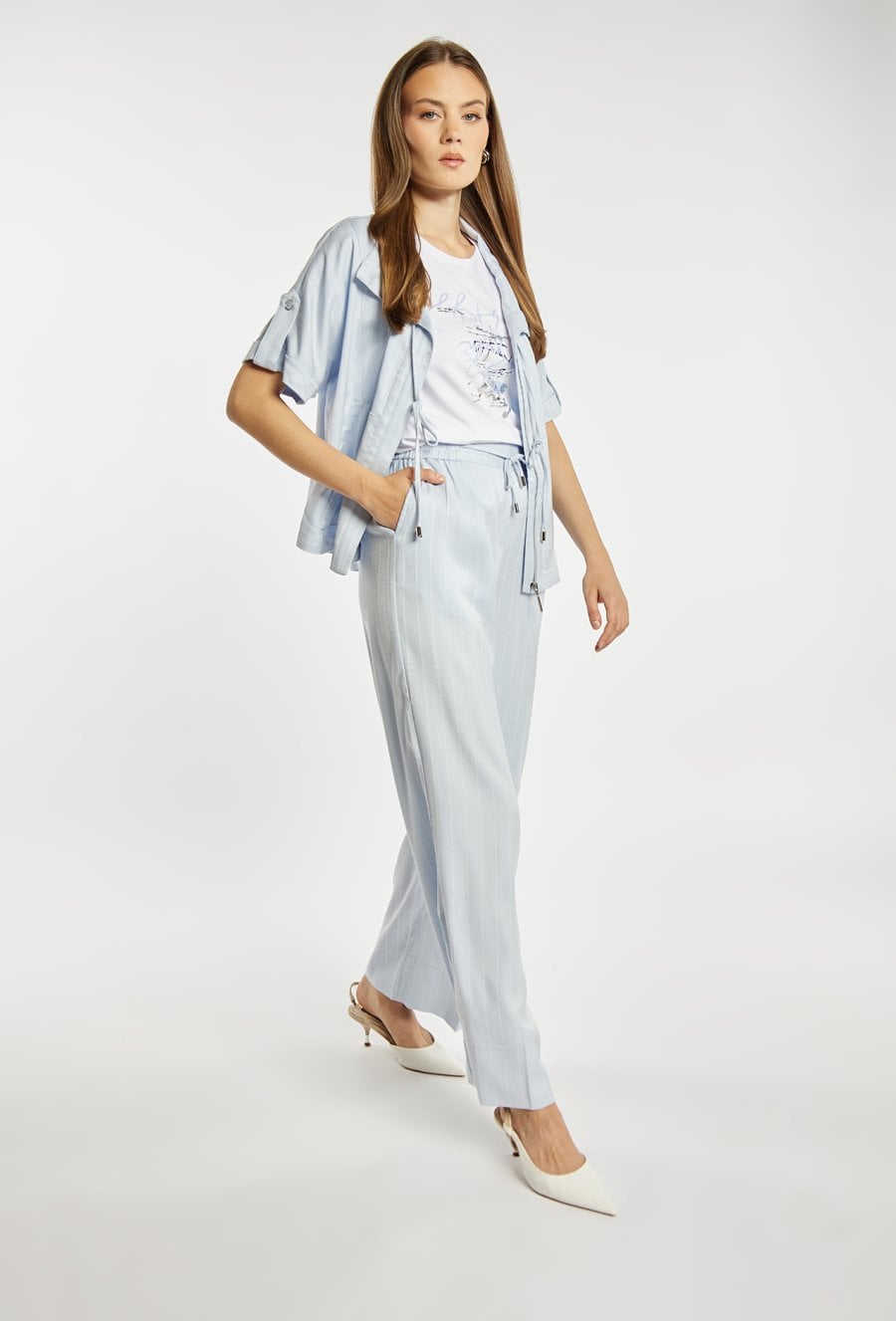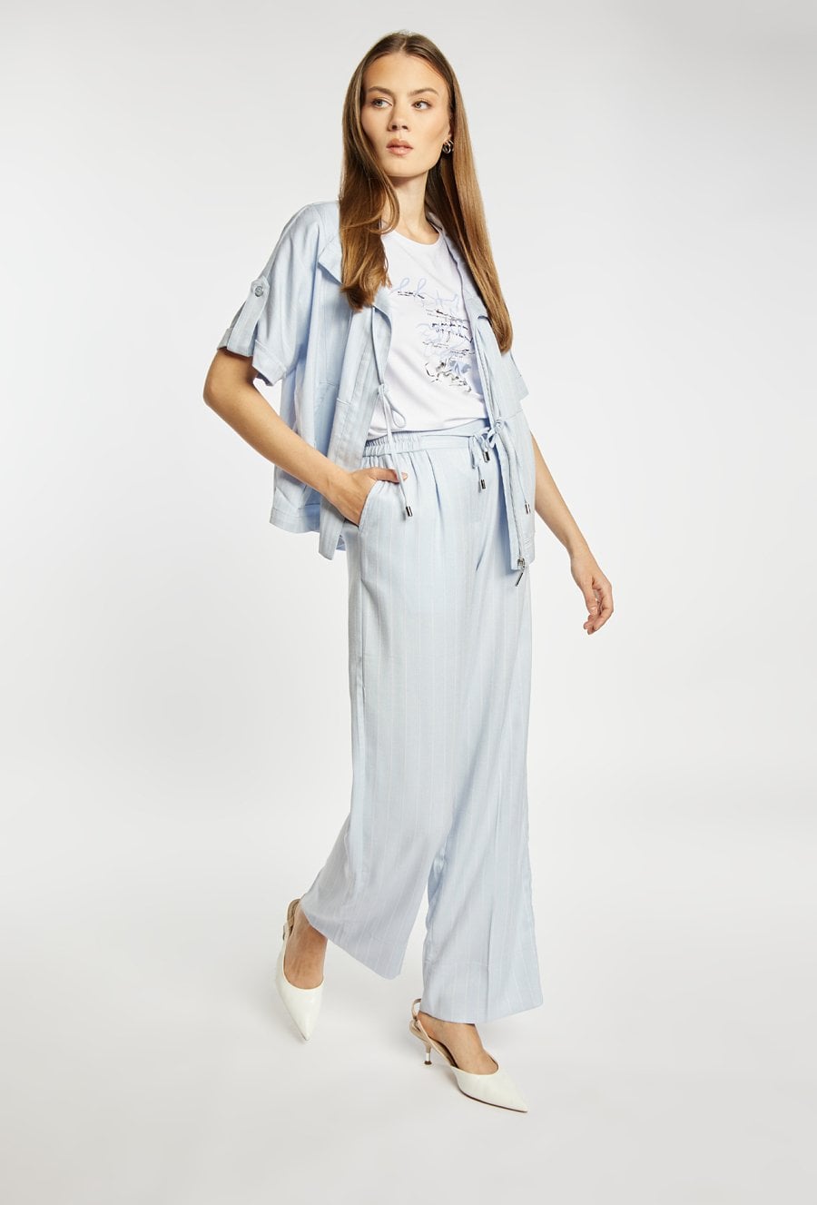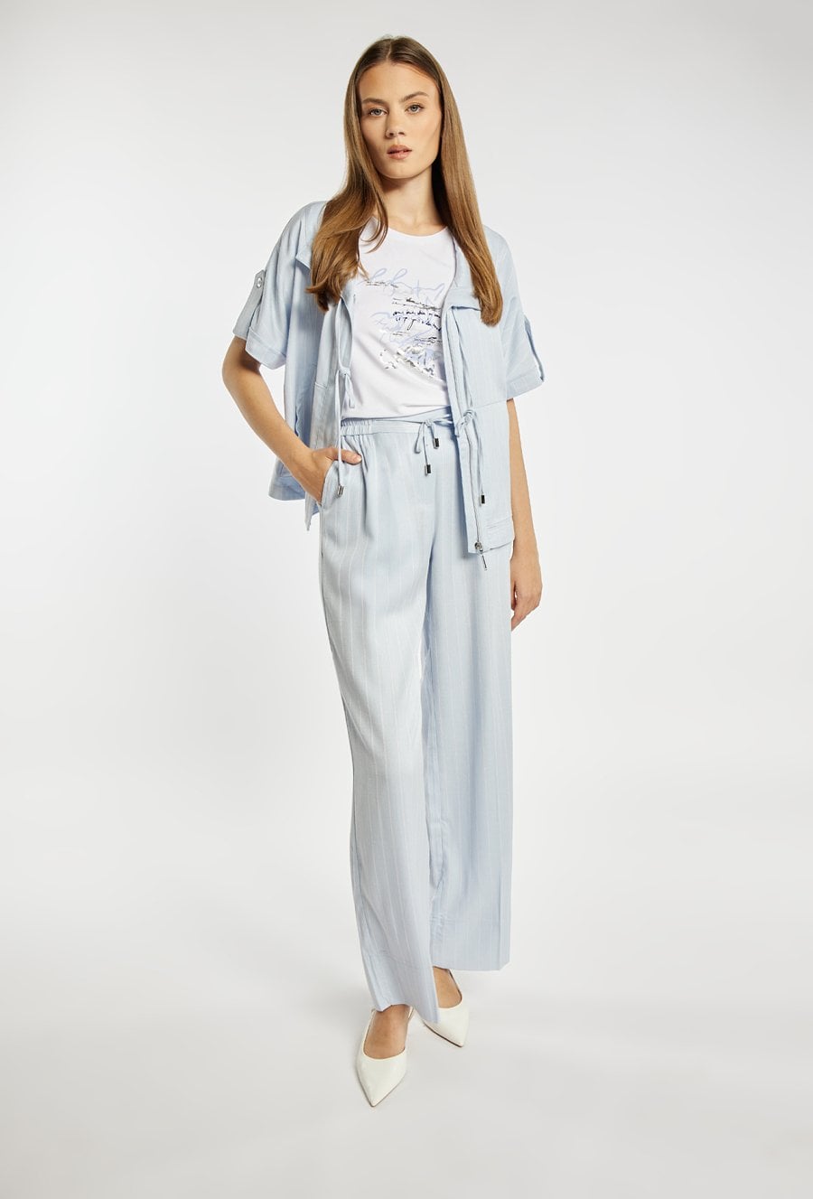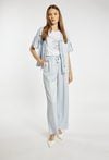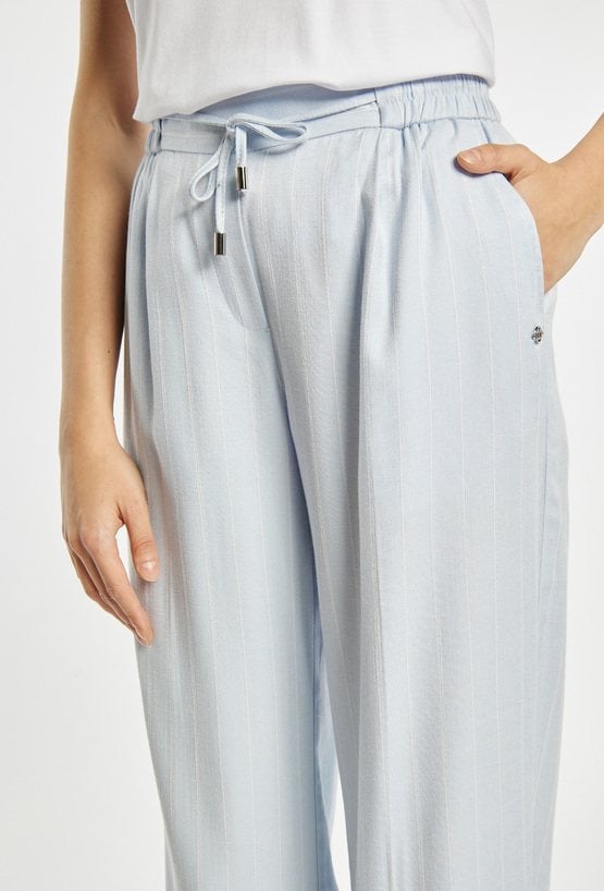 Spodnie damskie o luźnym, komfortowym kroju z szeroką nogawką. Model z wysokim stanem oraz elastycznym pasem z wiązaniem, który zapewnia wygodne dopasowanie. Pionowy wzór w paski optycznie wydłuża sylwetkę i nadaje całości stylowego charakteru. Modelka na zdjęciu ma 177 cm wzrostu i prezentuje rozmiar 36.