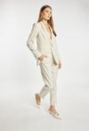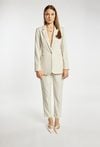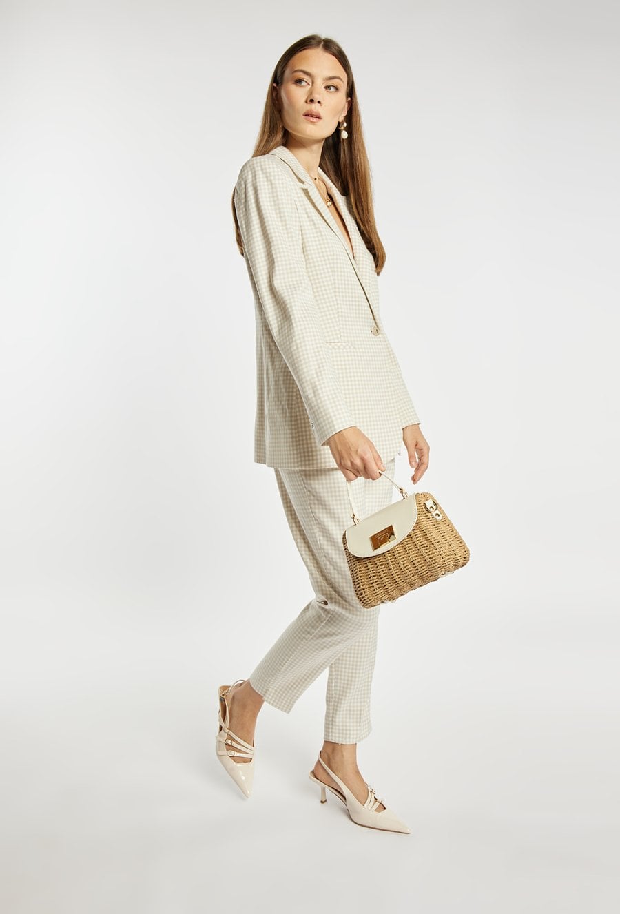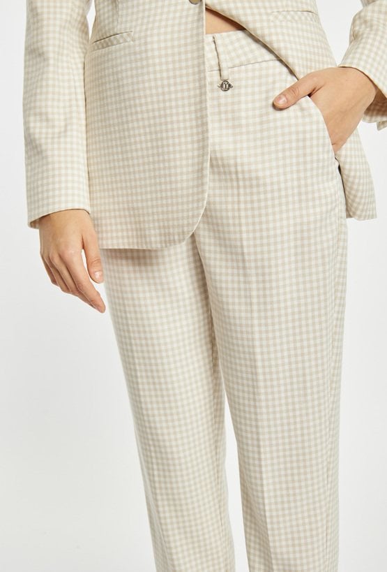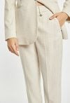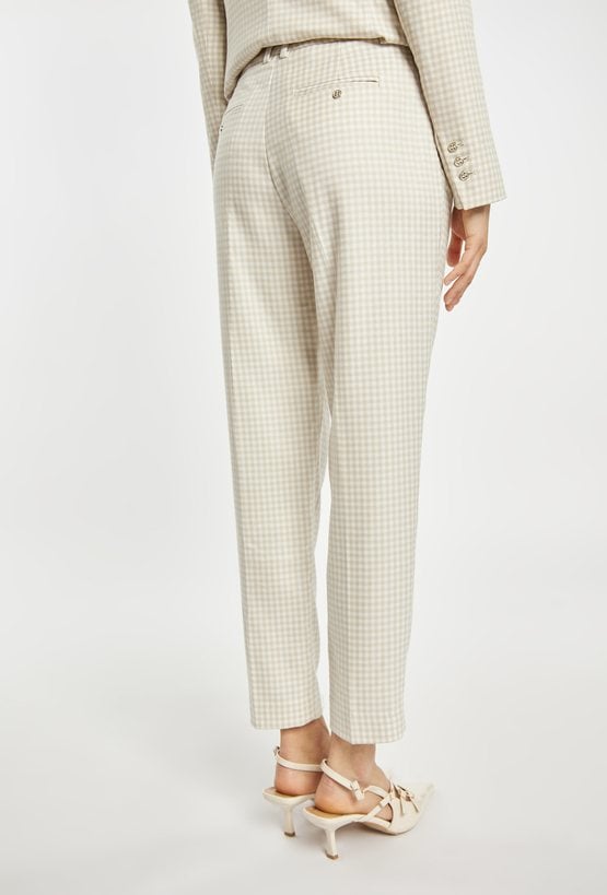 Spodnie damskie o eleganckim, prostym kroju z lekko zwężaną nogawką. Model z wysokim stanem oraz klasycznym zapięciem, zapewniającym dobre dopasowanie. Delikatny wzór w kratę nadaje całości stylowego i ponadczasowego charakteru. Można je zestawić z pasującą marynarką, tworząc spójny i elegancki komplet. Kod do marynarki: 26L-BZR0240. Modelka na zdjęciu ma 177 cm wzrostu i prezentuje rozmiar 36.