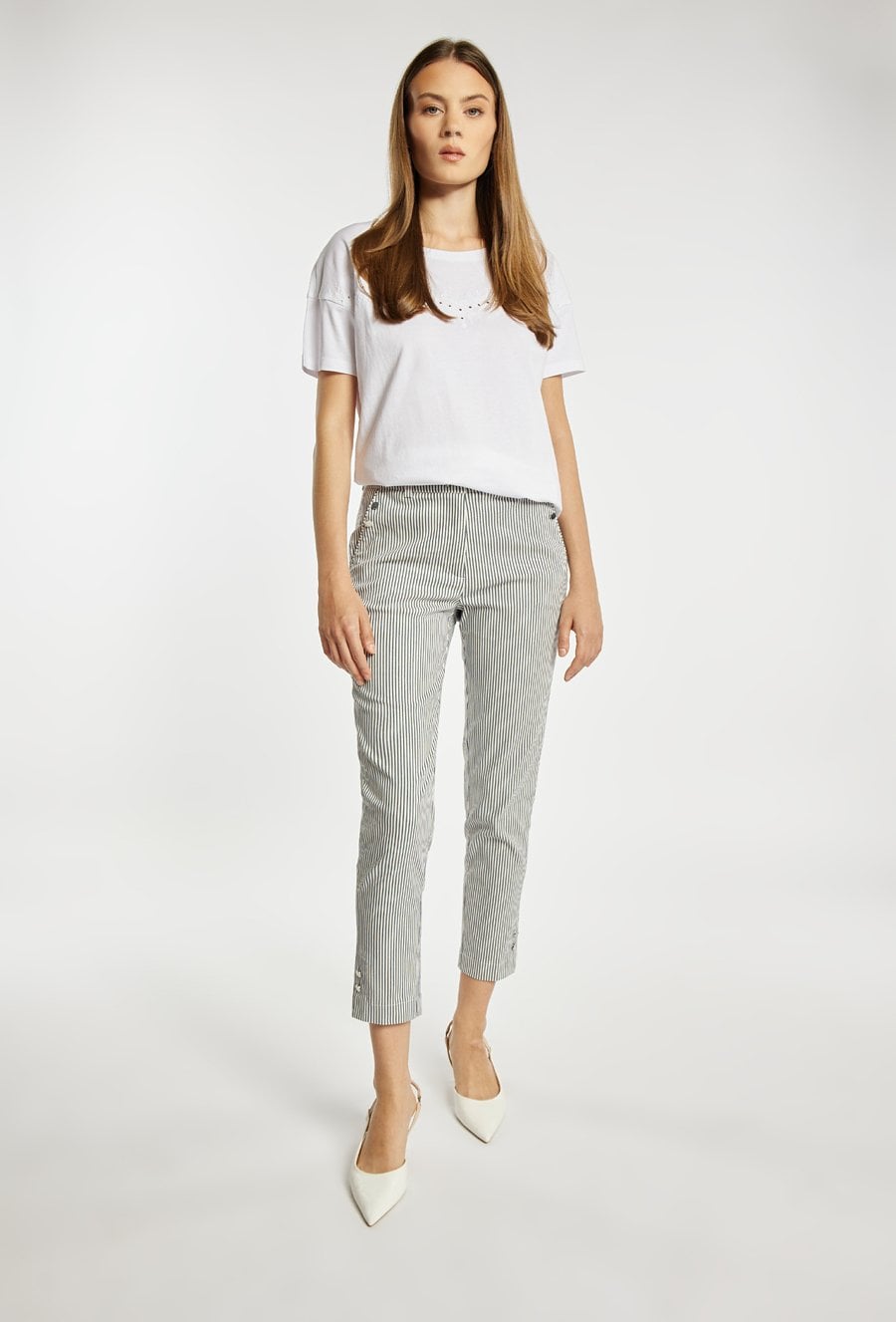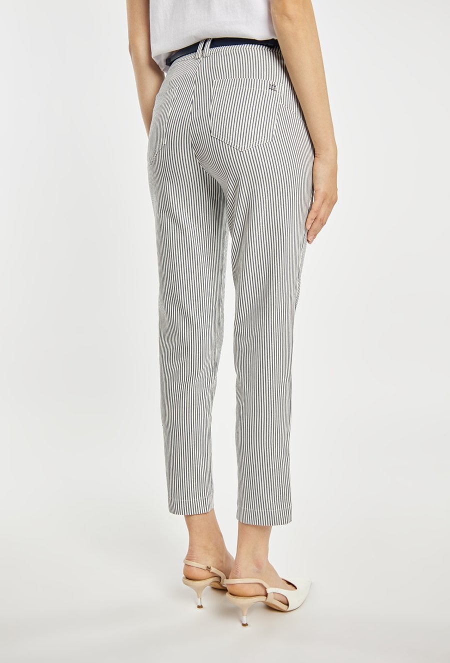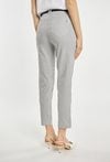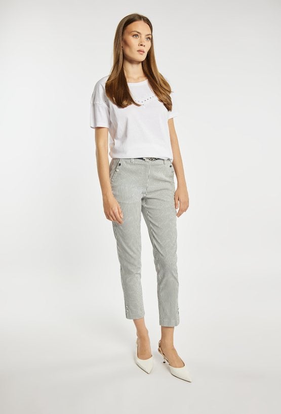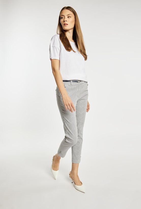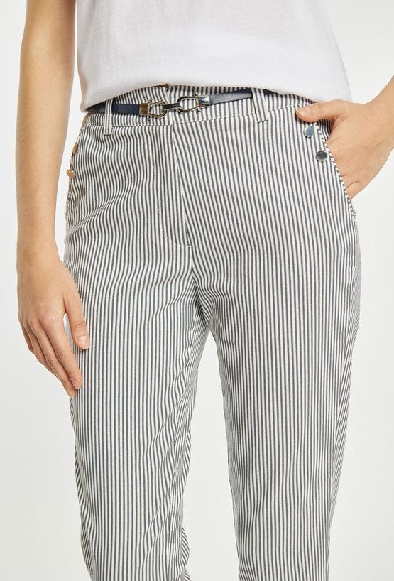Spodnie damskie o dopasowanym, eleganckim kroju z nogawką o długości 7/8. Model z wysokim stanem oraz paskiem w zestawie, który podkreśla talię i stanowi stylowy akcent. Delikatny, pionowy prążek optycznie wysmukla sylwetkę i dodaje całości lekkości. Modelka na zdjęciu ma 177 cm wzrostu i prezentuje rozmiar 36.
