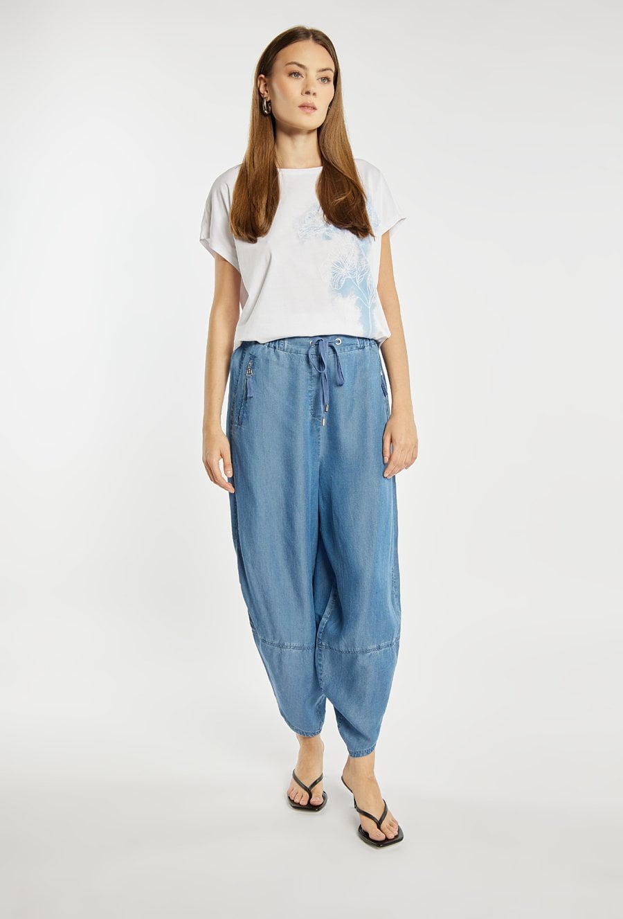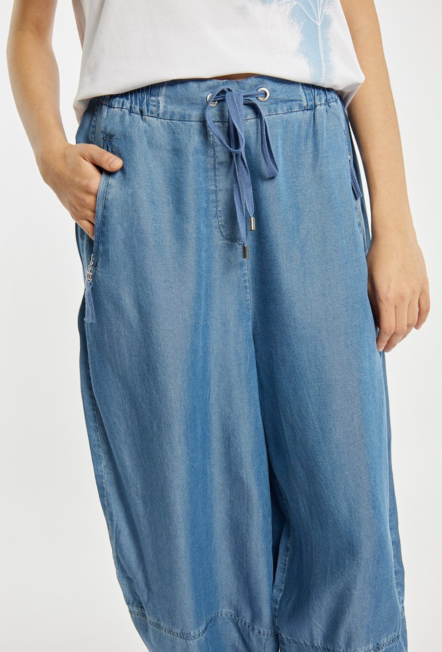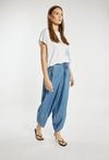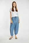 Letnie spodnie damskie o luźnym, swobodnym kroju. Model z szerokimi nogawkami o delikatnie zwężanym dołem, które nadają sylwetce nowoczesnego charakteru. W pasie elastyczna talia z wiązaniem zapewniająca komfort noszenia i dobre dopasowanie. Modelka na zdjęciu ma 177 cm wzrostu i prezentuje rozmiar 36.