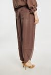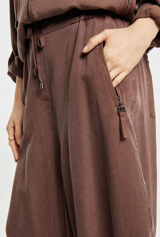 Letnie spodnie damskie o luźnym, swobodnym kroju. Model z szerokimi nogawkami o delikatnie zwężanym dołem, które nadają sylwetce nowoczesnego charakteru. W pasie elastyczna talia z wiązaniem zapewniająca komfort noszenia i dobre dopasowanie. Modelka na zdjęciu ma 177 cm wzrostu i prezentuje rozmiar 36.