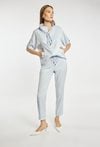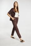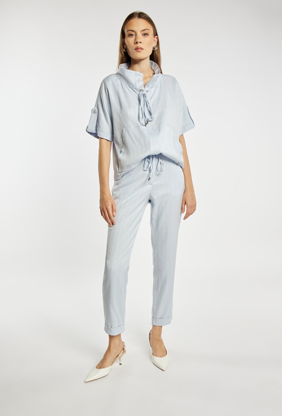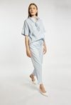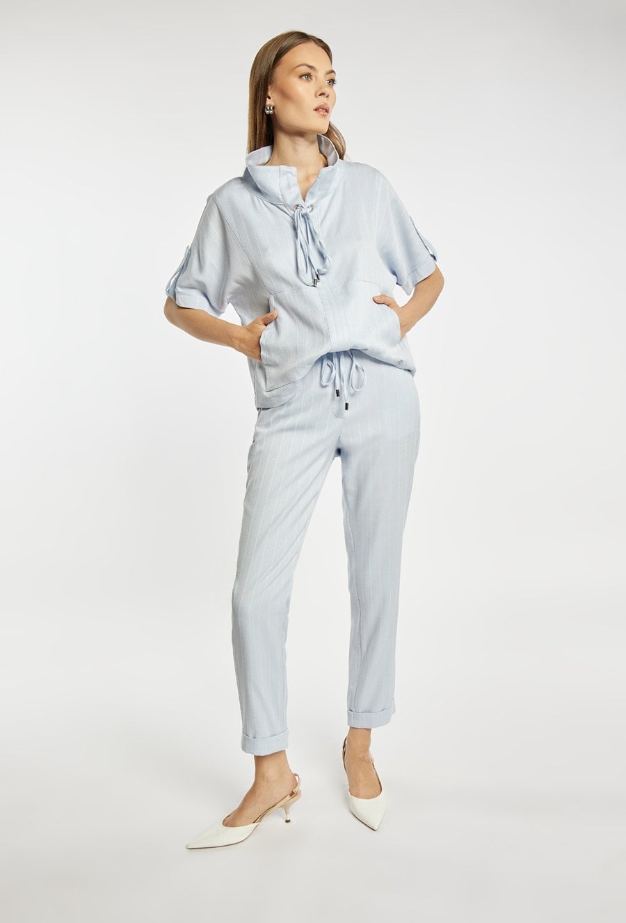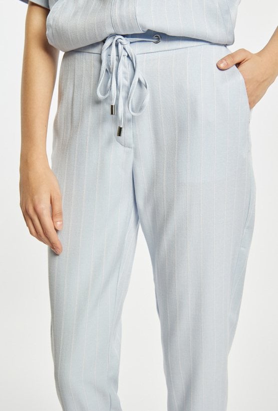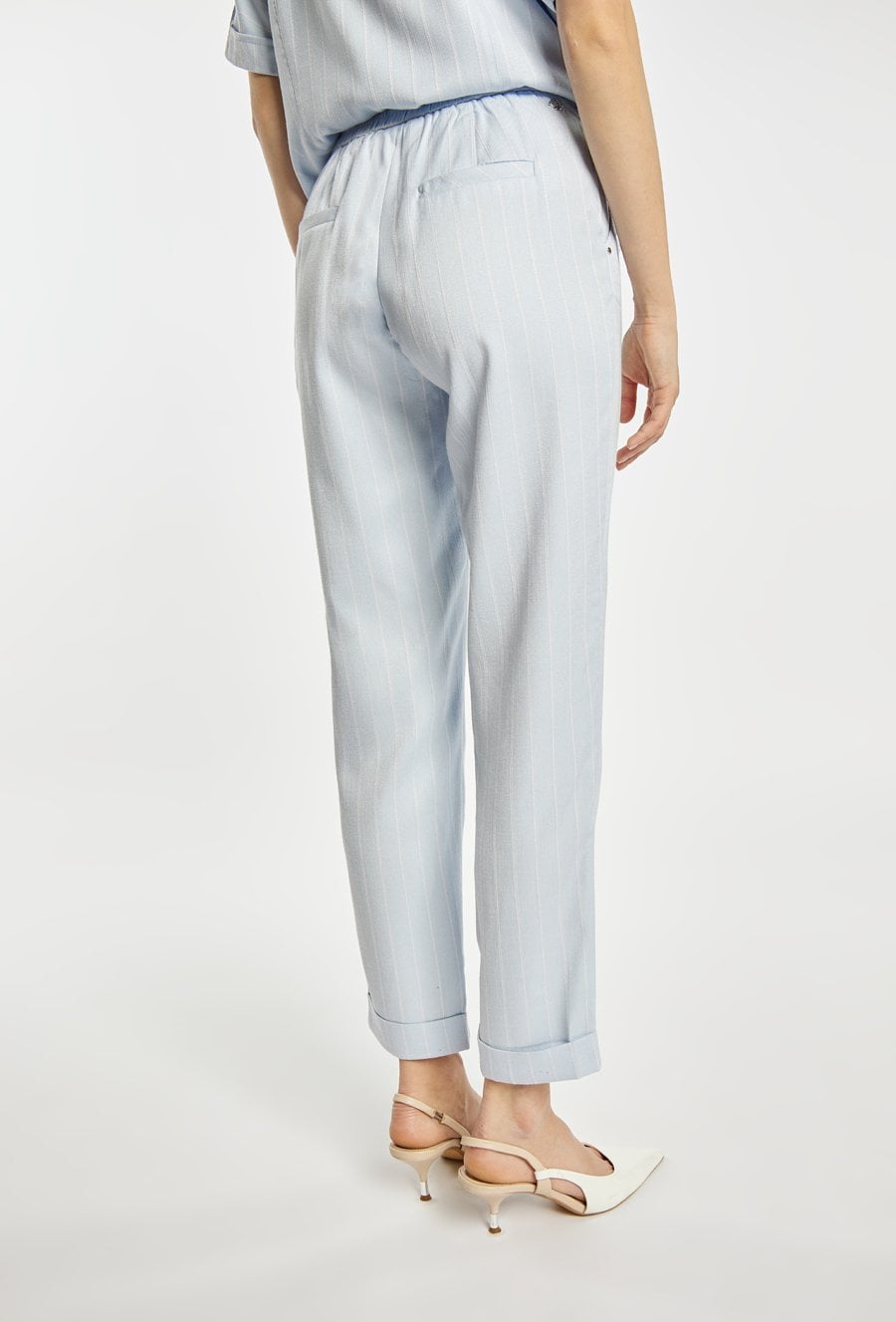 Spodnie damskie o eleganckim, lekko dopasowanym kroju z nogawką o długości 7/8. Model z wysokim stanem oraz klasycznym zapięciem, zapewniającym dobre dopasowanie. Pionowy wzór w paski optycznie wysmukla sylwetkę i nadaje całości stylowego charakteru. Spodnie idealne do codziennych oraz bardziej eleganckich stylizacji. Modelka na zdjęciu ma 177 cm wzrostu i prezentuje rozmiar 36.