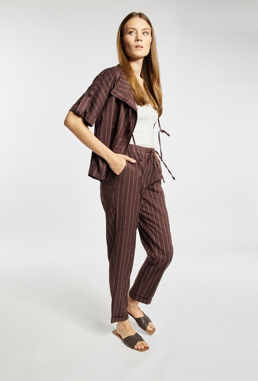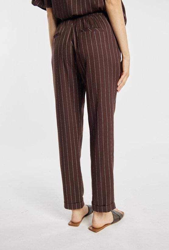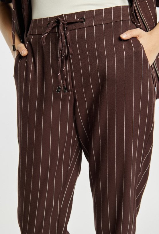 Spodnie damskie o eleganckim, lekko dopasowanym kroju z nogawką o długości 7/8. Model z wysokim stanem oraz klasycznym zapięciem, zapewniającym dobre dopasowanie. Pionowy wzór w paski optycznie wysmukla sylwetkę i nadaje całości stylowego charakteru. Spodnie idealne do codziennych oraz bardziej eleganckich stylizacji. Modelka na zdjęciu ma 177 cm wzrostu i prezentuje rozmiar 36.