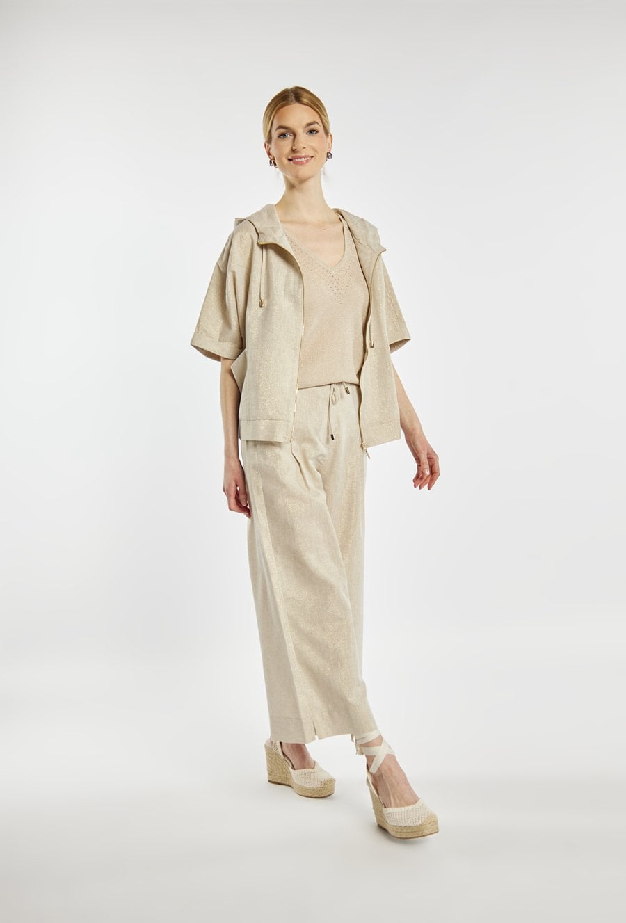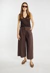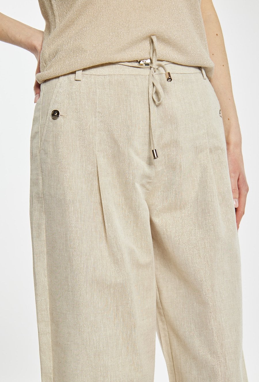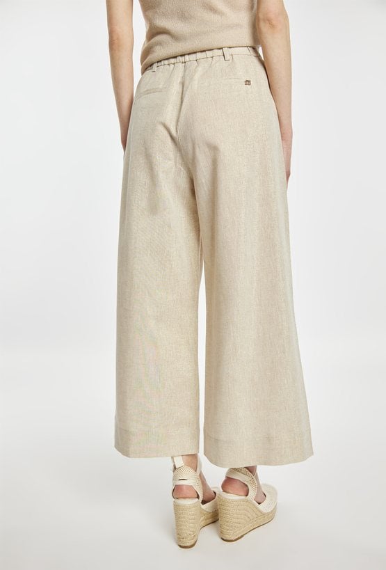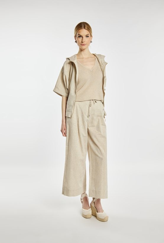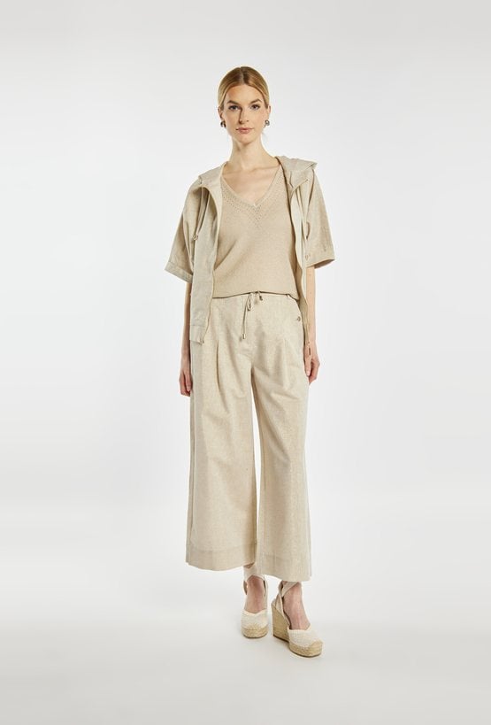 Spodnie damskie o luźnym, komfortowym kroju z szeroką nogawką o długości 7/8. Model z wysokim stanem oraz elastycznym pasem z wiązaniem, który zapewnia wygodne dopasowanie. Modelka na zdjęciu ma 177 cm wzrostu i prezentuje rozmiar 36.