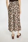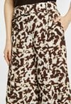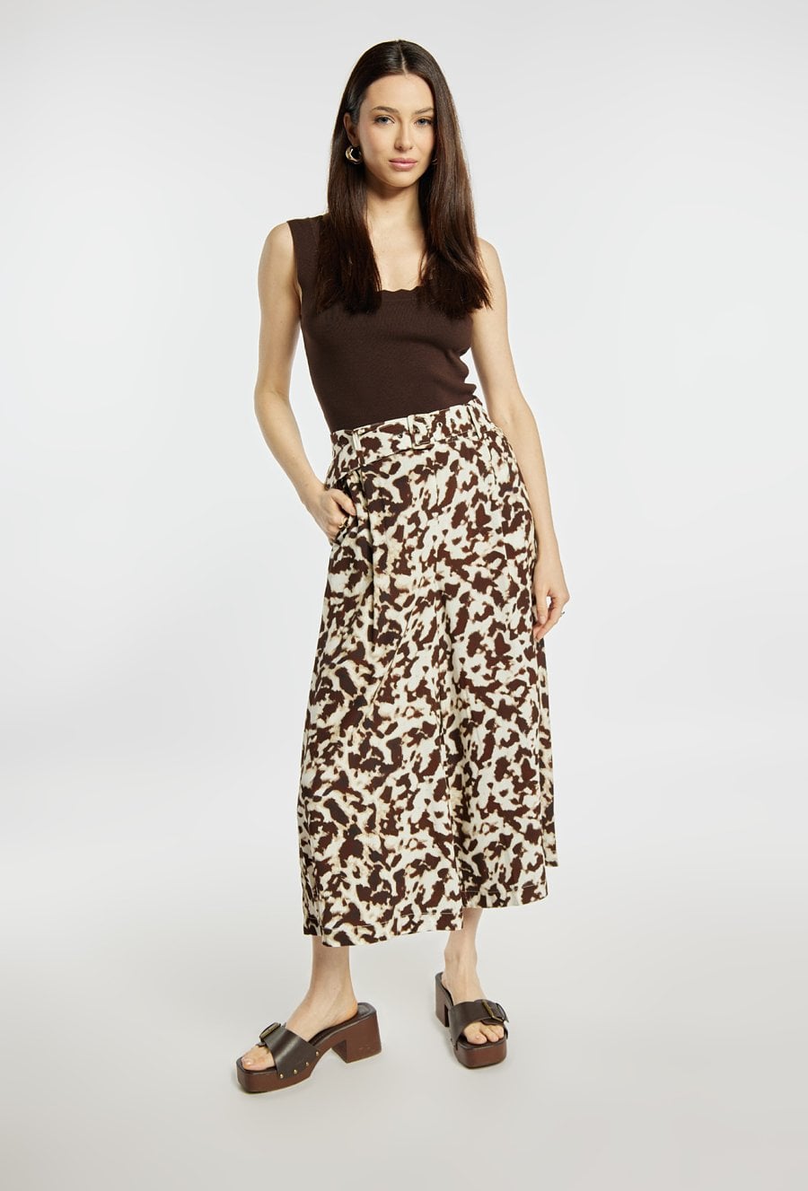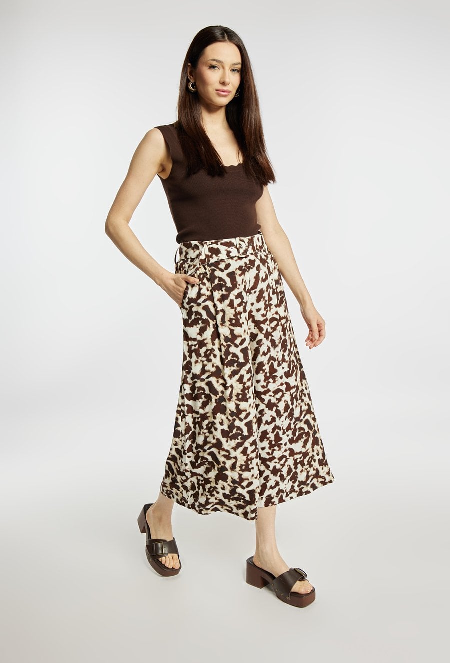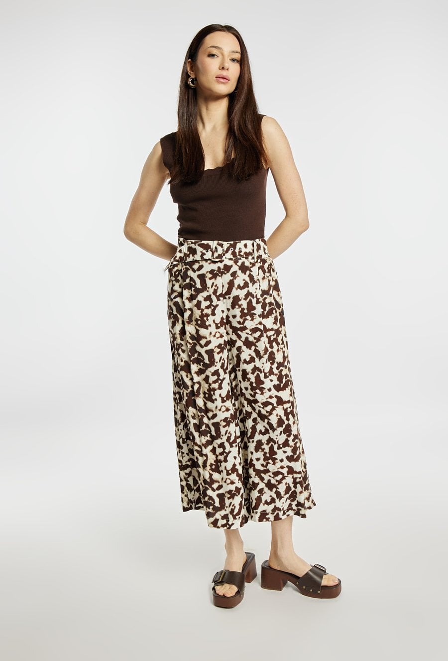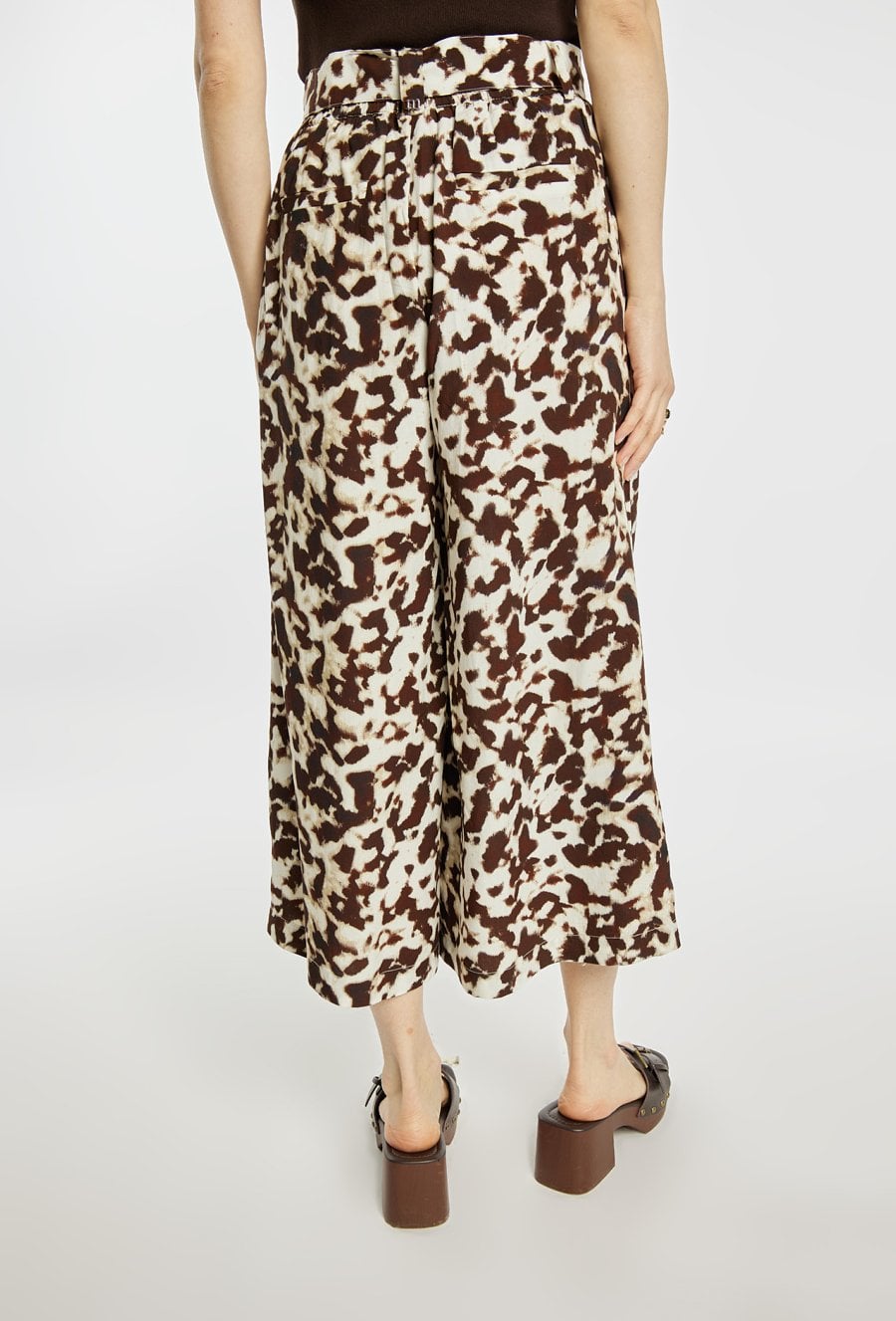 Spodnie damskie o swobodnym kroju z szeroką, luźno układającą się nogawką. Model 7/8, wykonany z lekkiego, przyjemnego w noszeniu materiału, ozdobionego wyrazistym, kontrastowym wzorem. Wysoki stan podkreśla talię i zapewnia wygodę noszenia. Świetnie sprawdzą się w letnich stylizacjach. Modelka na zdjęciu ma 177 cm wzrostu i prezentuje rozmiar 36.