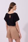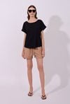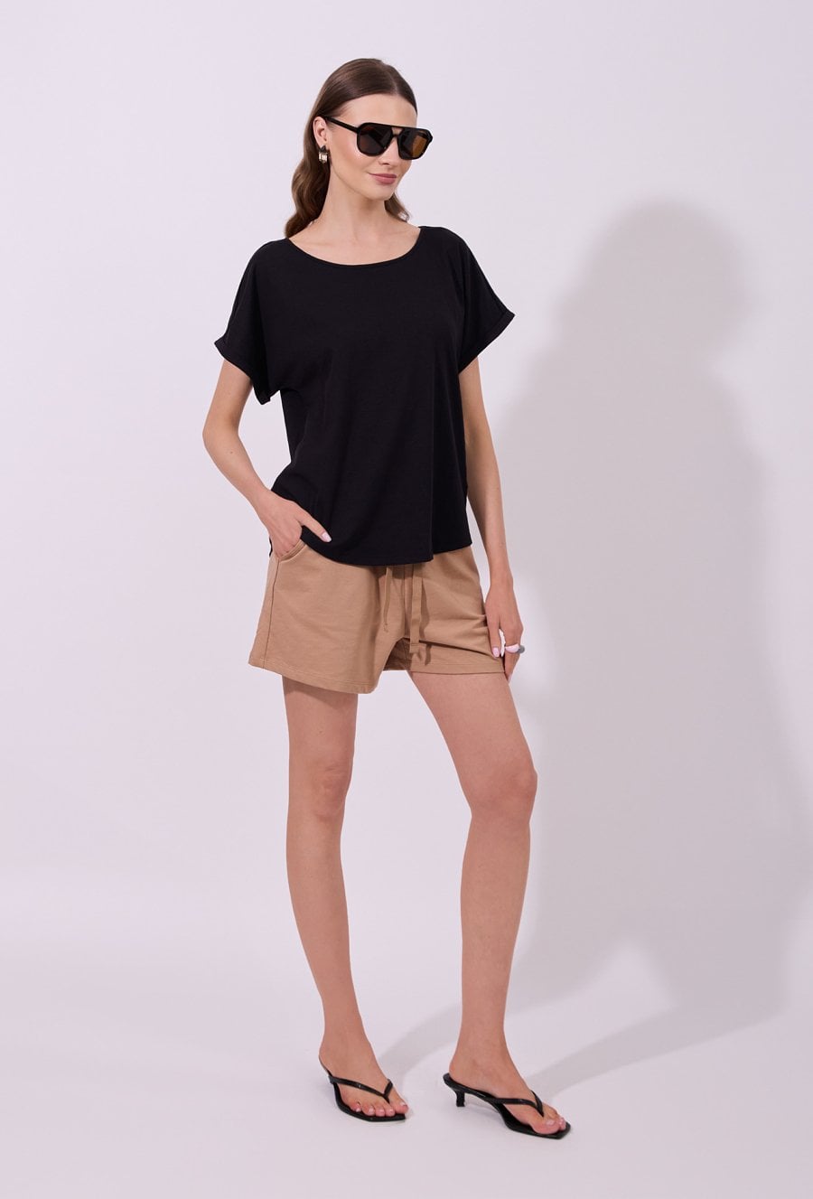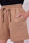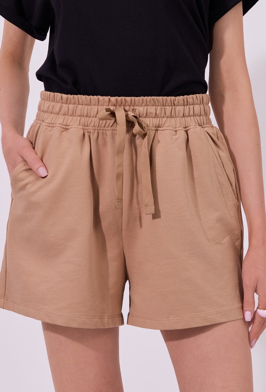 Spodenki damskie o luźnym, komfortowym kroju. Model z wysokim stanem oraz elastycznym pasem z wiązaniem, który zapewnia wygodne dopasowanie i swobodę noszenia. Spodenki idealnie sprawdzą się w codziennych, letnich stylizacjach oraz podczas wypoczynku. Modelka na zdjęciu ma 177 cm wzrostu i prezentuje rozmiar S.