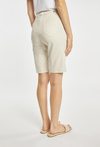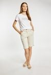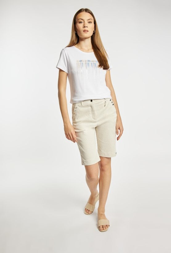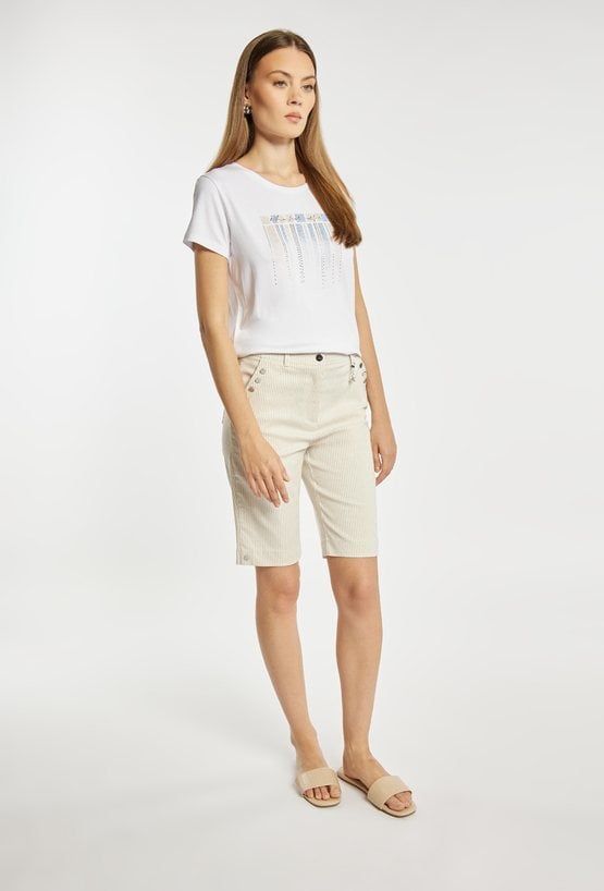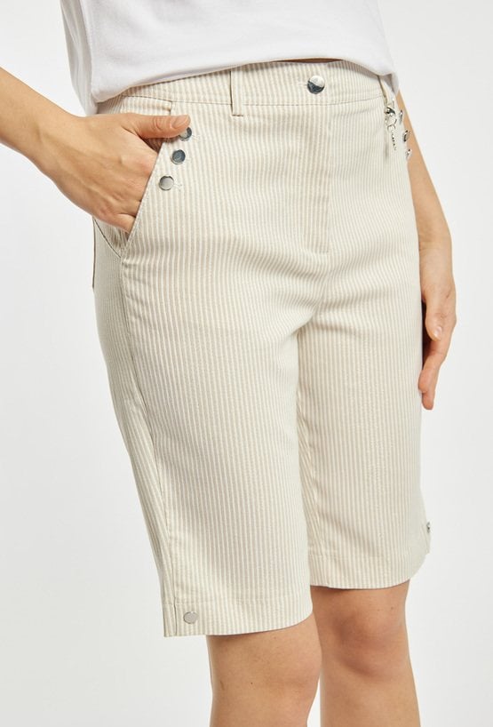 Spodenki damskie o dopasowanym, klasycznym kroju przed kolano. Model z wysokim stanem oraz zapięciem, zapewniającym dobre dopasowanie. Pionowy wzór w paski optycznie wysmukla sylwetkę i nadaje całości eleganckiego charakteru. Modelka na zdjęciu ma 177 cm wzrostu i prezentuje rozmiar 36.