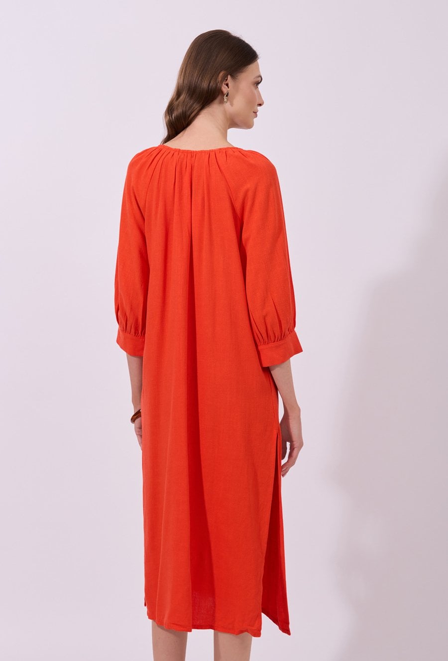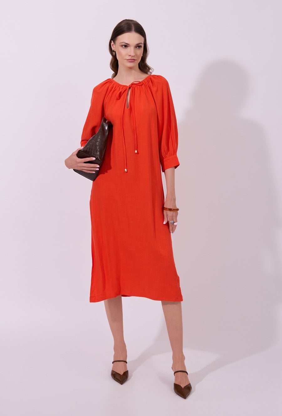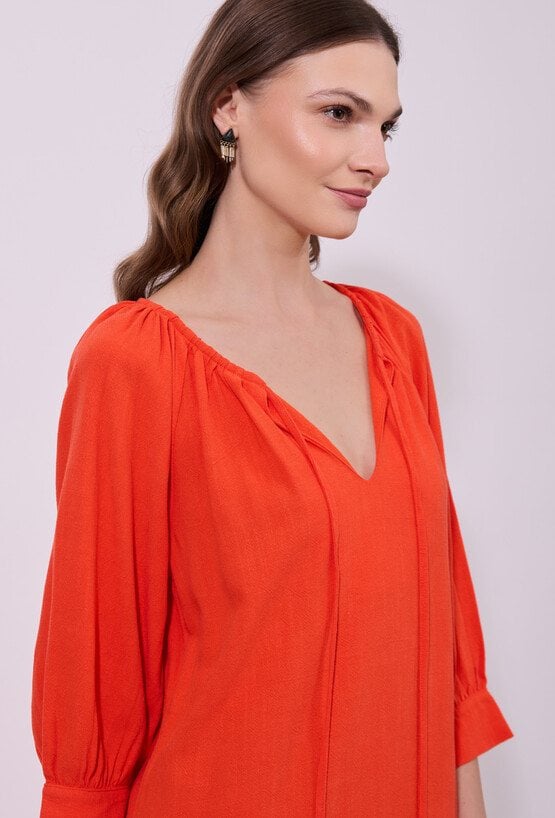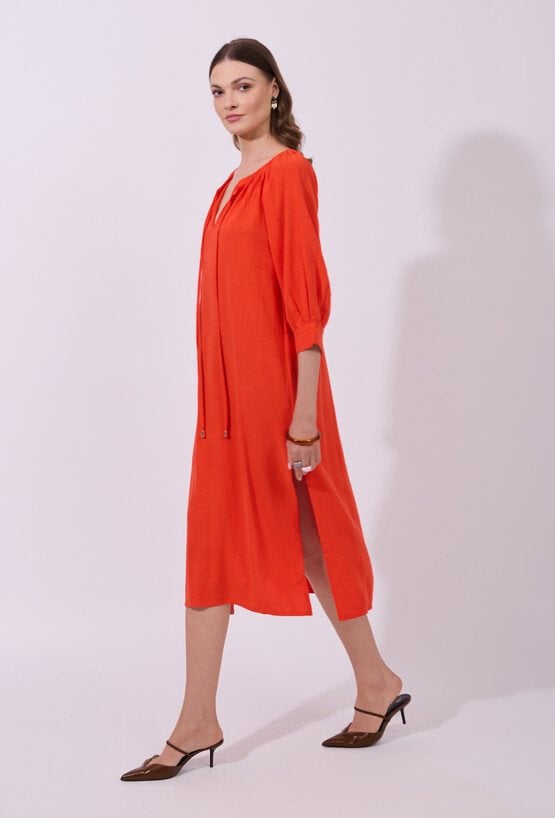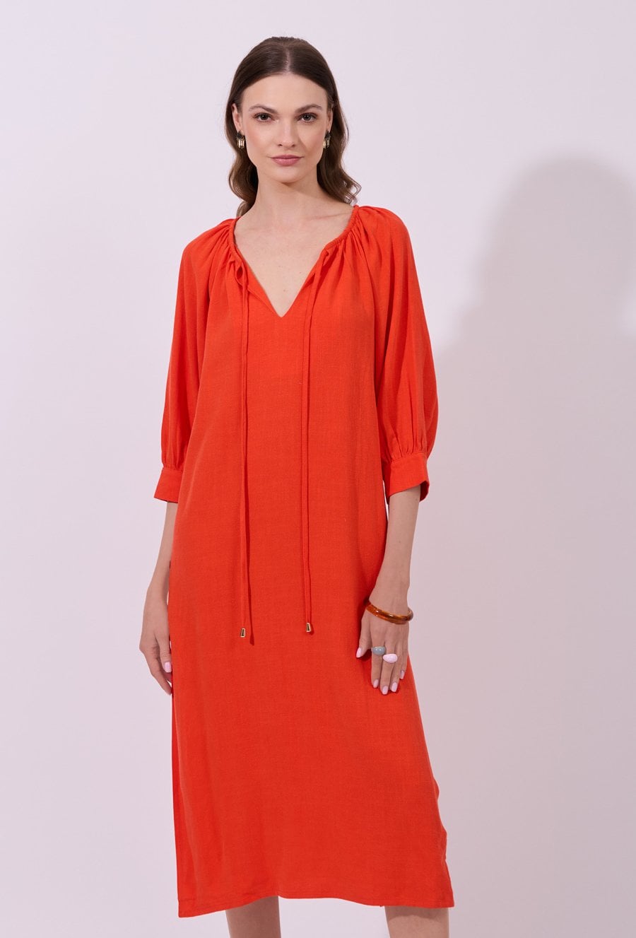 Sukienka damska o luźnym, prostym kroju midi z rękawem o długości 3/4. Model z dekoltem w kształcie litery V oraz subtelnym marszczeniem przy szyi i wiązaniem z troczkami. Swobodny fason zapewnia komfort noszenia i przewiewność. Modelka na zdjęciu ma 177 cm wzrostu i prezentuje rozmiar 36.