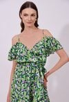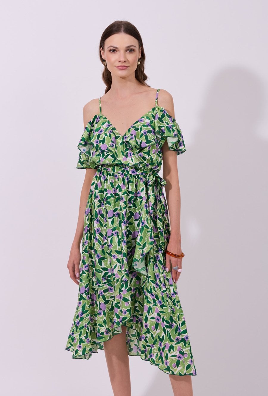 Sukienka damska o zwiewnym, rozkloszowanym kroju midi. Model z dekoltem w kształcie litery V oraz cienkimi ramiączkami, uzupełniony efektownymi, opadającymi rękawkami typu hiszpanka, które nadają całości romantycznego charakteru. W talii zastosowano wiązanie, podkreślające sylwetkę i zapewniające dobre dopasowanie. Modelka na zdjęciu ma 177 cm wzrostu i prezentuje rozmiar 36.