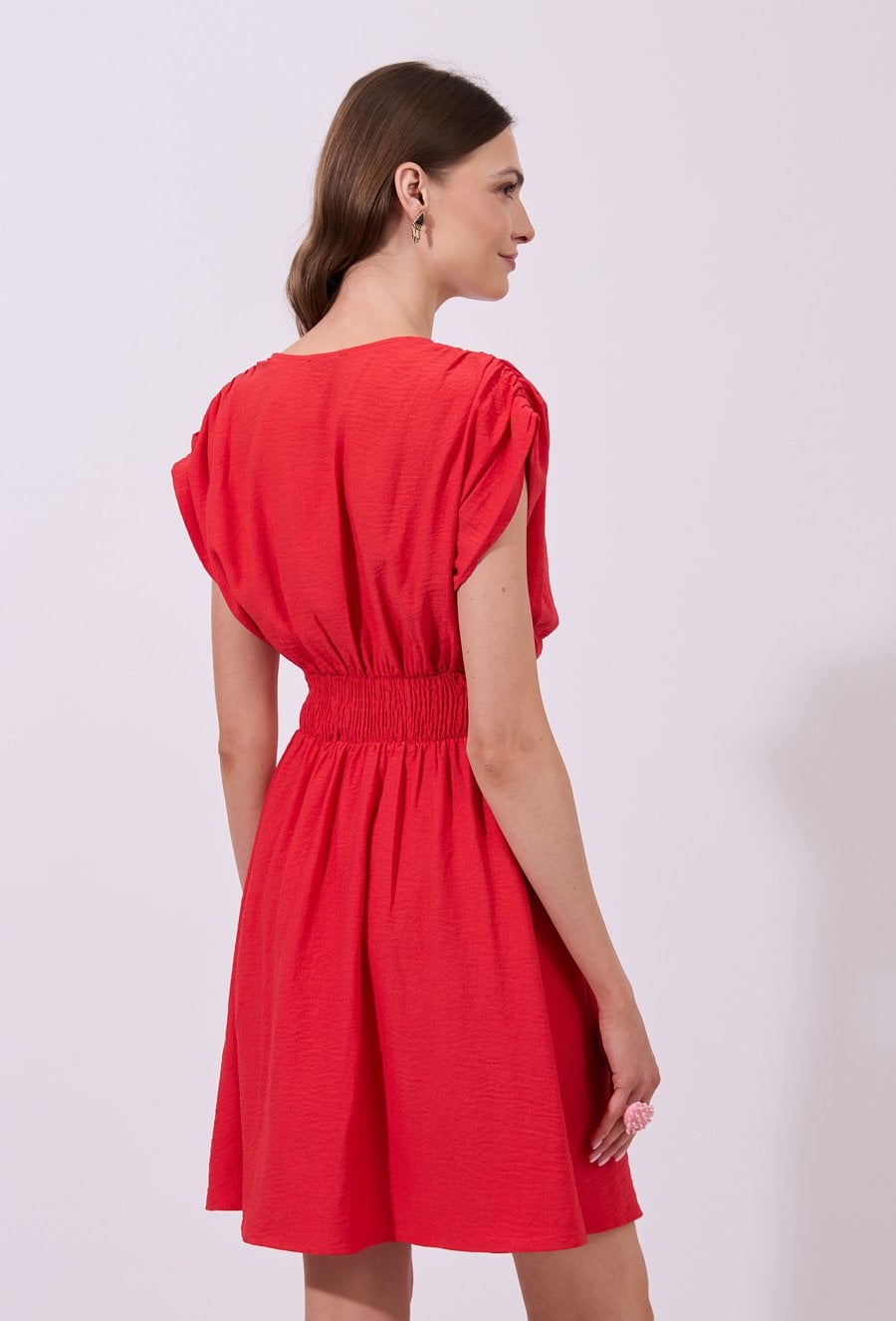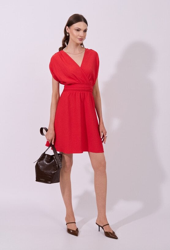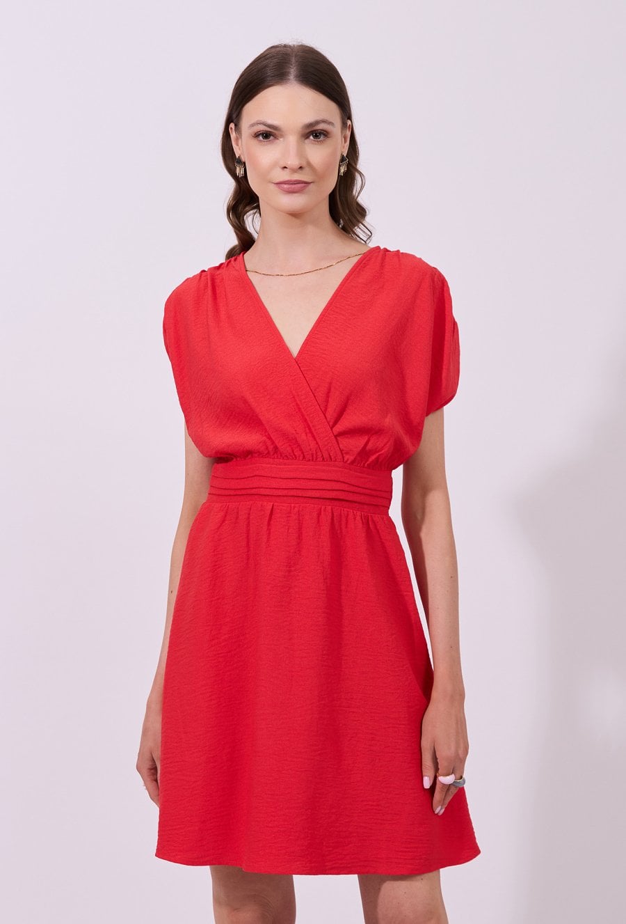 Sukienka damska o kobiecym, lekko rozkloszowanym kroju mini z krótkim rękawem. Model z kopertowym dekoltem w kształcie litery V. Idealna na lato oraz do codziennych stylizacji. Modelka na zdjęciu ma 177 cm wzrostu i prezentuje rozmiar S.