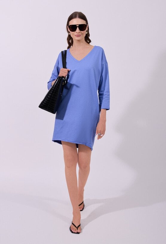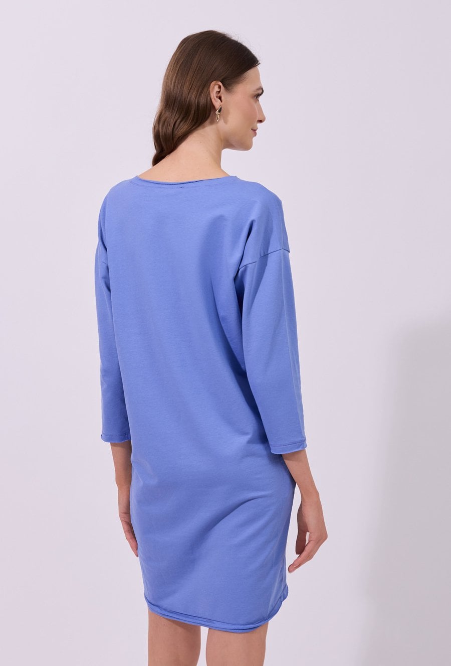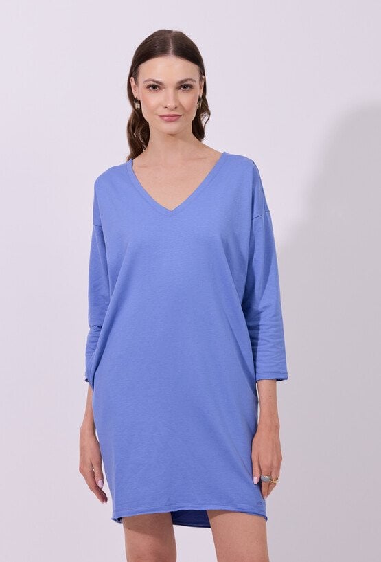 Sukienka damska o luźnym, prostym kroju mini z długim rękawem. Model z dekoltem w kształcie litery V. Praktyczna kieszeń dodaje funkcjonalności i casualowego charakteru. Sukienka idealna na co dzień oraz do wygodnych, letnich stylizacji. Modelka na zdjęciu ma 177 cm wzrostu i prezentuje rozmiar S.