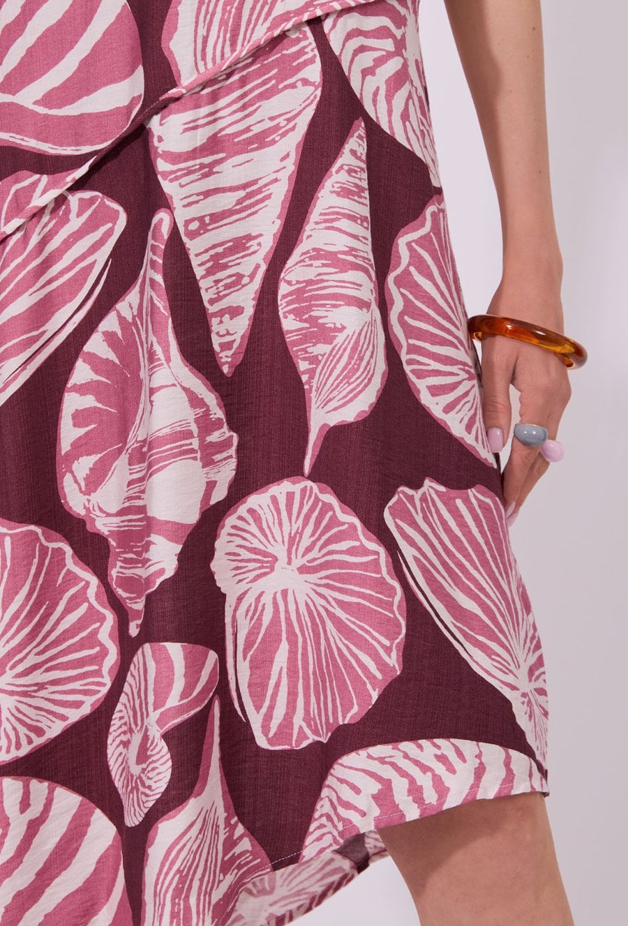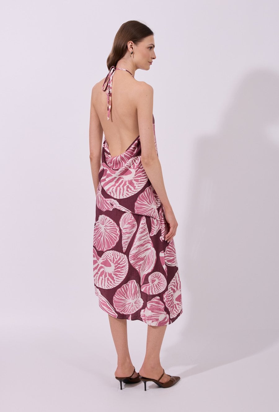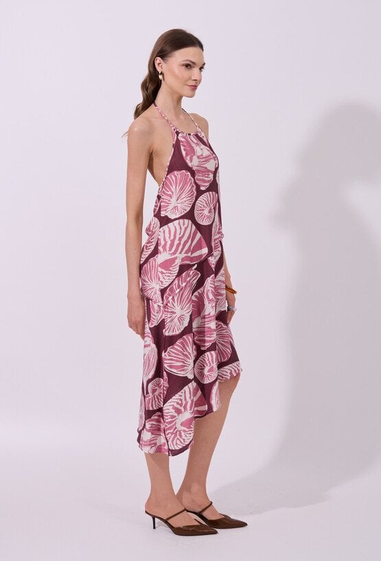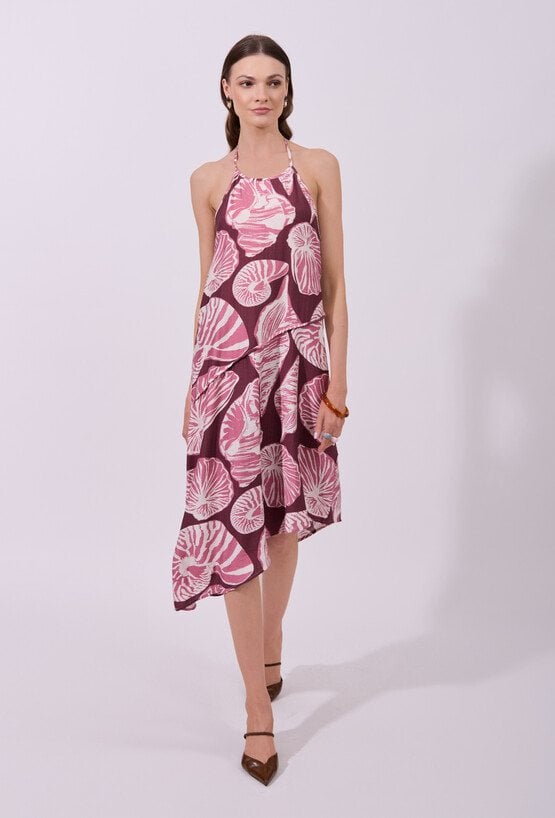 Sukienka damska o lekkim, zwiewnym kroju midi na cienkich ramiączkach wiązanych na szyi. Model z odkrytymi ramionami, który pięknie eksponuje górną część sylwetki. Asymetryczny dół nadaje całości dynamicznego, nowoczesnego charakteru. Całość zdobi wyrazisty wzór, który przyciąga uwagę i idealnie wpisuje się w letni klimat. Modelka na zdjęciu ma 177 cm wzrostu i prezentuje rozmiar S.