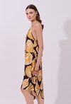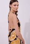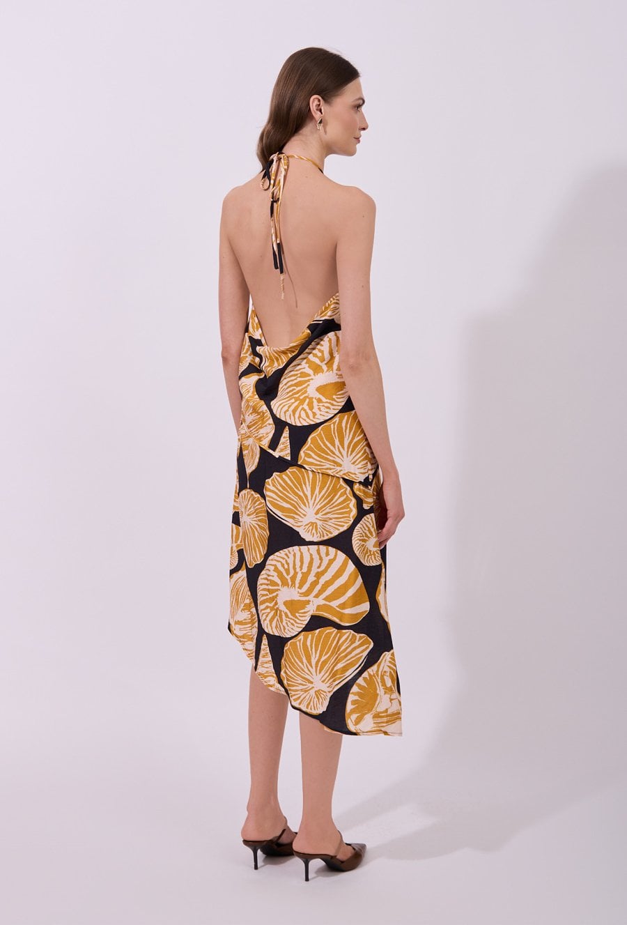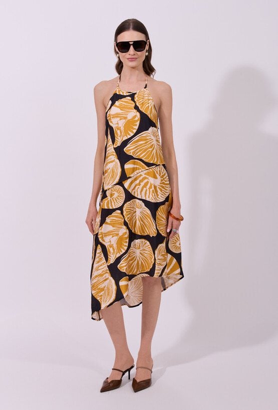 Sukienka damska o lekkim, zwiewnym kroju midi na cienkich ramiączkach wiązanych na szyi. Model z odkrytymi ramionami, który pięknie eksponuje górną część sylwetki. Asymetryczny dół nadaje całości dynamicznego, nowoczesnego charakteru. Całość zdobi wyrazisty wzór, który przyciąga uwagę i idealnie wpisuje się w letni klimat. Modelka na zdjęciu ma 177 cm wzrostu i prezentuje rozmiar S.