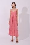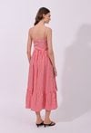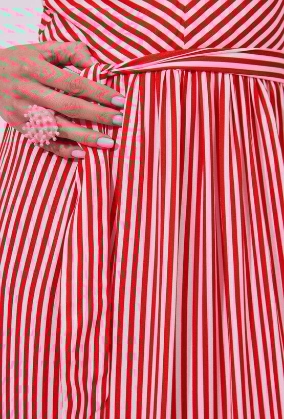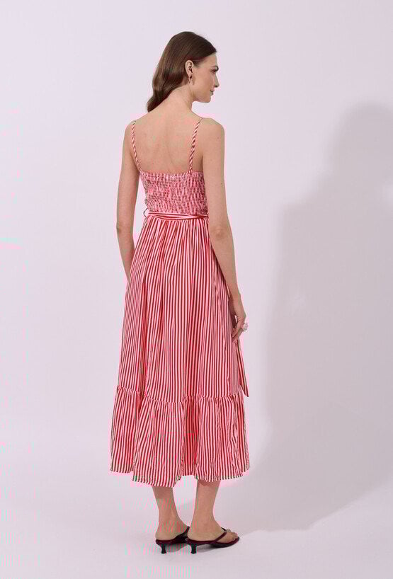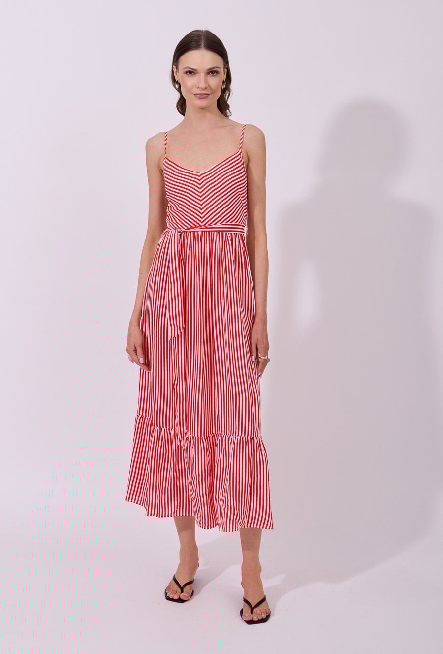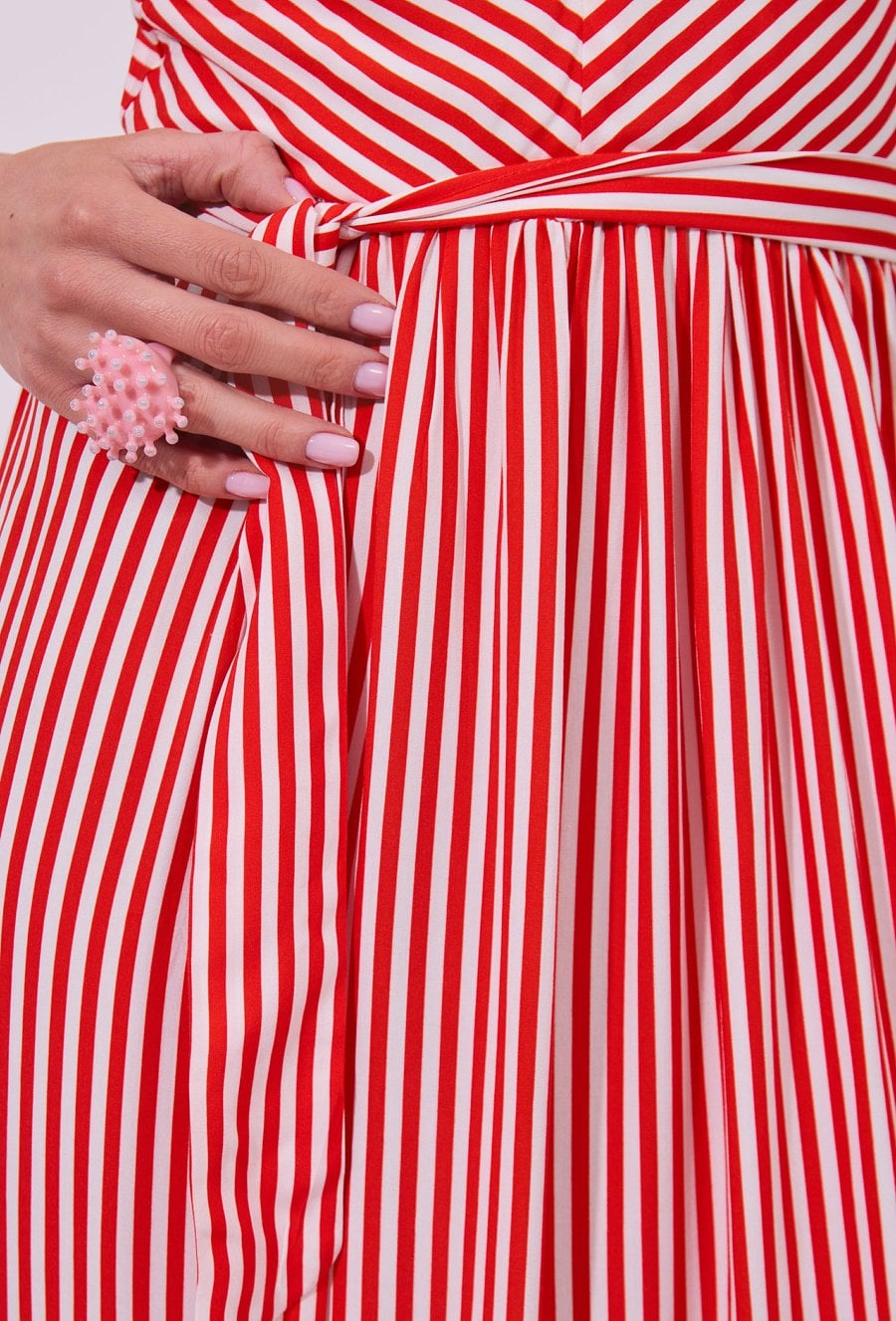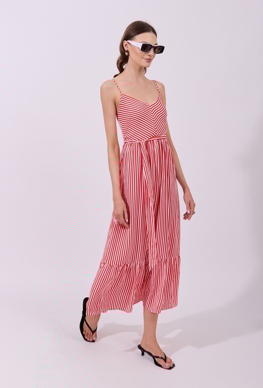Sukienka damska o lekkim, zwiewnym kroju midi na cienkich ramiączkach. Model z dekoltem w kształcie litery V, który subtelnie podkreśla linię szyi. W talii zastosowano wiązanie, pozwalające na dopasowanie fasonu i podkreślenie sylwetki. Modelka na zdjęciu ma 177 cm wzrostu i prezentuje rozmiar 36.