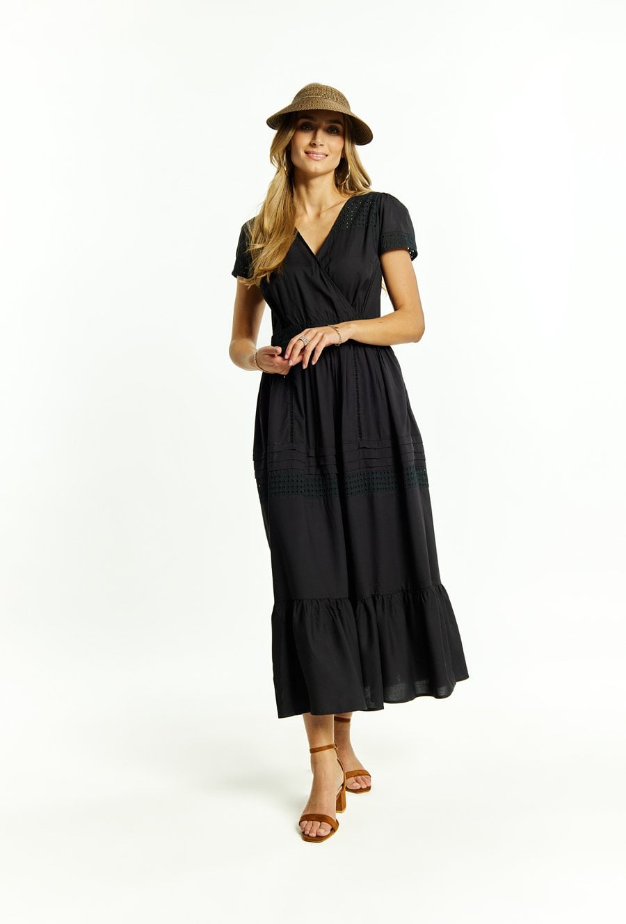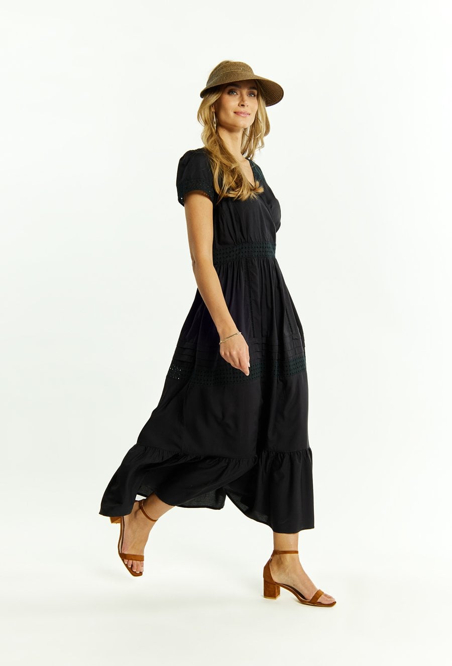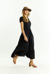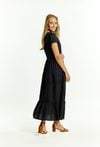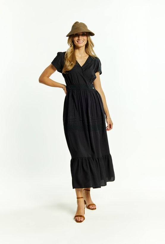 Sukienka damska wykonana z przyjemnego, cienkiego materiału. Sukienka o długości maxi, krótkim rękawem, dekoltem w literę V oraz falbankami na dole. Sukienka z ażurowymi wstawkami, świetnie sprawdzi się na letnie dni. Modelka na zdjęciu ma 177 cm wzrostu i prezentuje rozmiar 36.