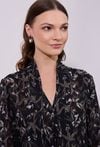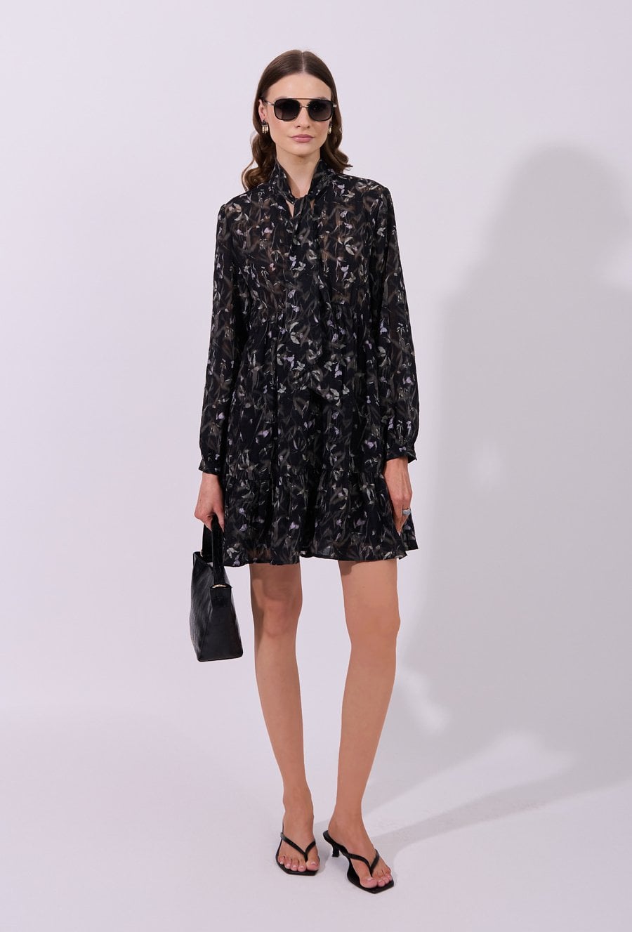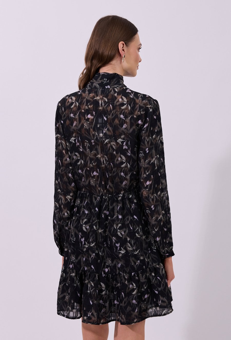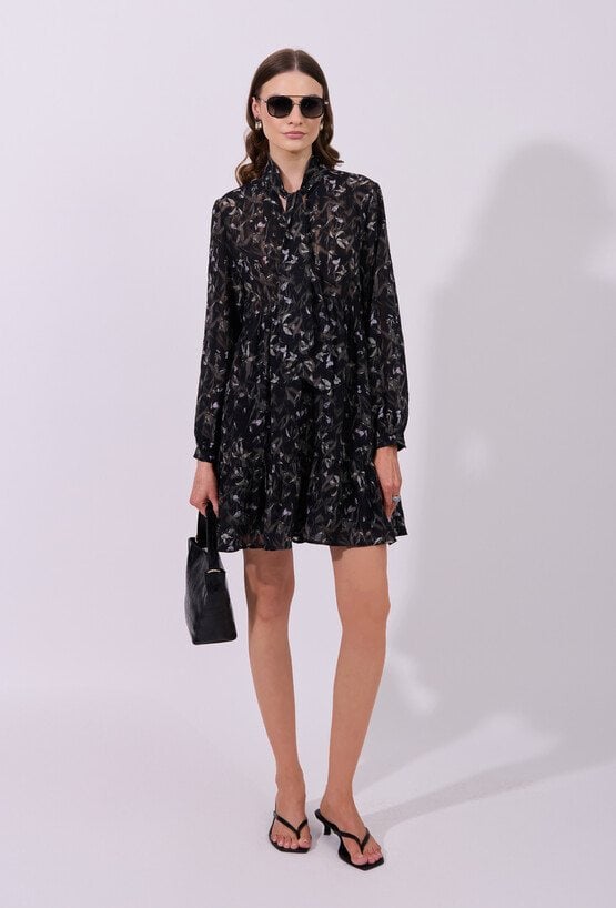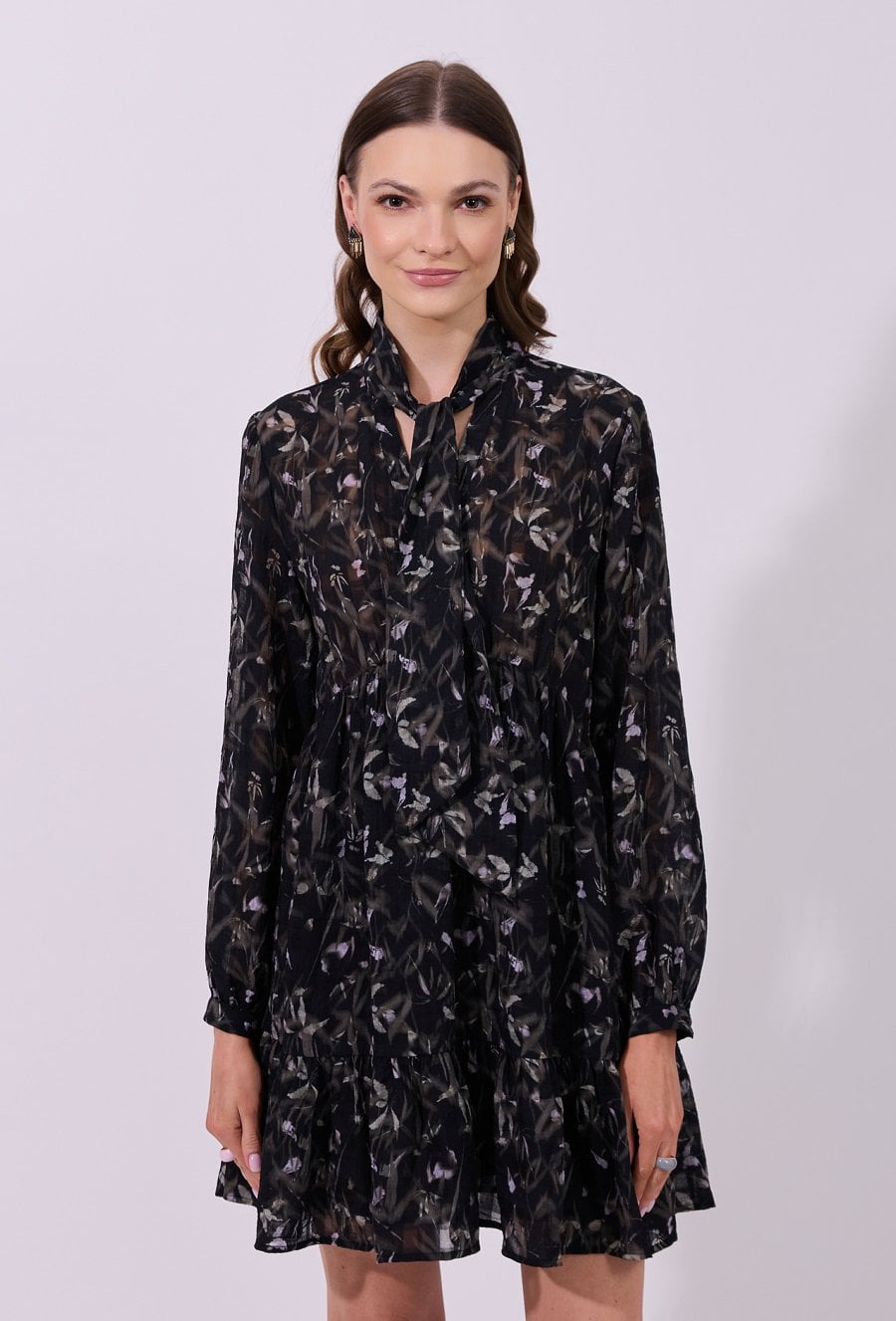 Sukienka damska o lekkim, zwiewnym kroju mini z długim rękawem. Model z wiązaniem przy dekolcie, które dodaje całości eleganckiego i kobiecego charakteru. Luźny fason zapewnia komfort noszenia i swobodę ruchów. Całość zdobi subtelny, wielokolorowy wzór, nadający stylizacji oryginalnego wyrazu. Idealna na co dzień oraz do bardziej stylowych stylizacji. Modelka na zdjęciu ma 177 cm wzrostu i prezentuje rozmiar 36.