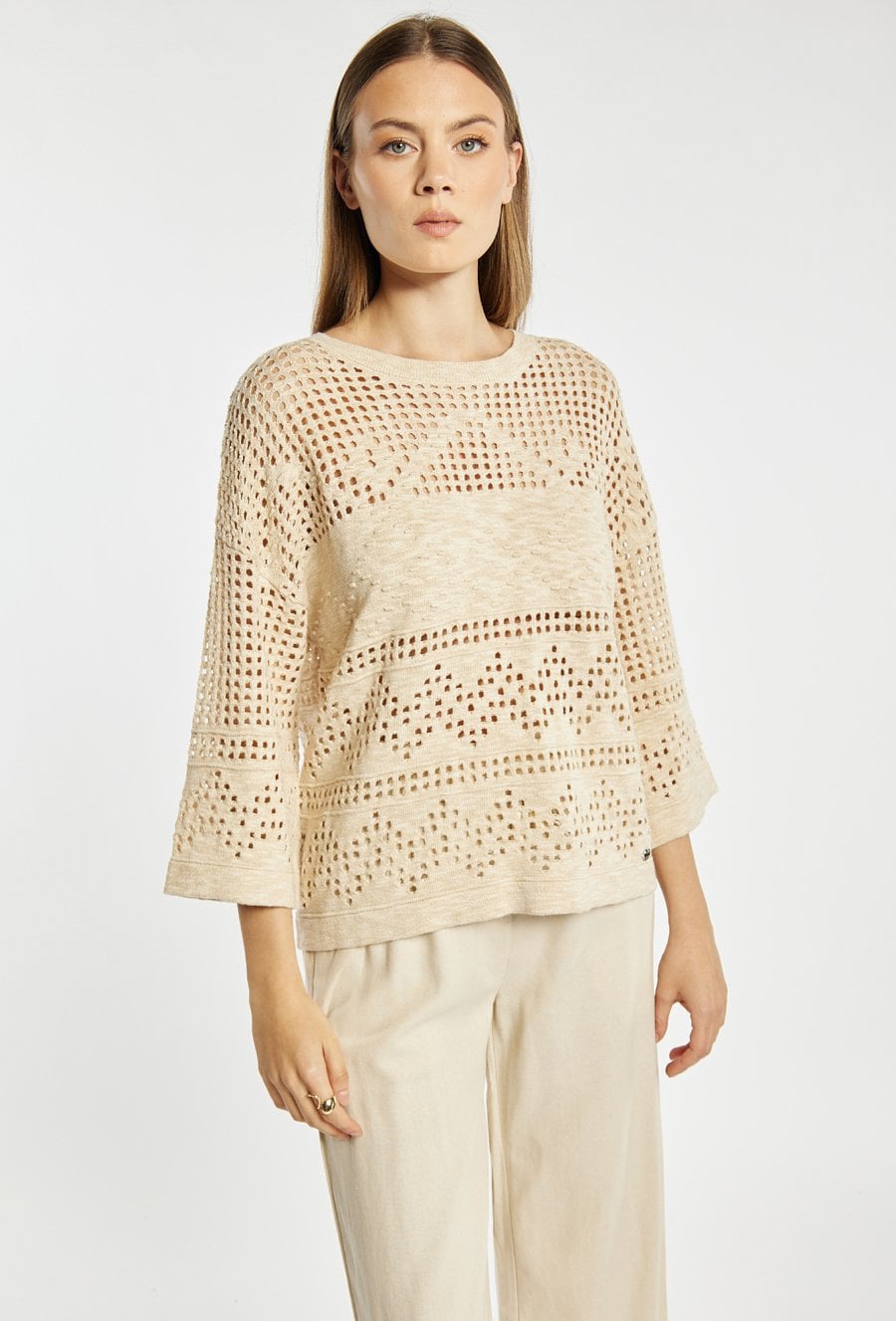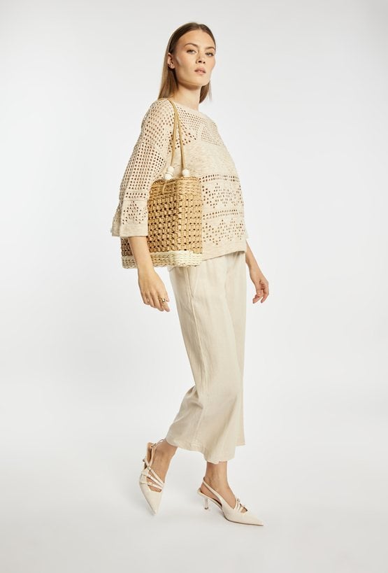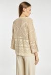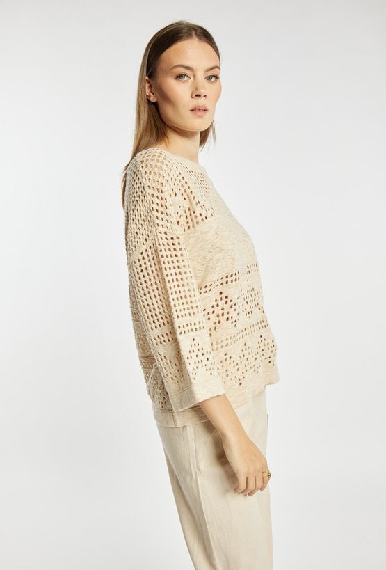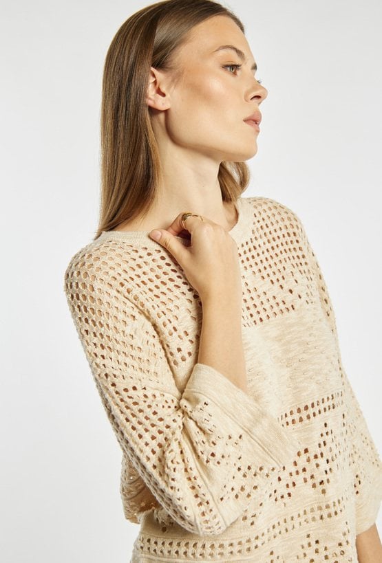Sweter damski o luźnym, swobodnym kroju z rękawem o długości 3/4. Model z klasycznym, półokrągłym dekoltem. Wykonany z ażurowej dzianiny o dekoracyjnym wzorze, zapewniającej lekkość i przewiewność. Idealny jako stylowe uzupełnienie codziennych, szczególnie letnich stylizacji. Modelka na zdjęciu ma 177 cm wzrostu i prezentuje rozmiar S.