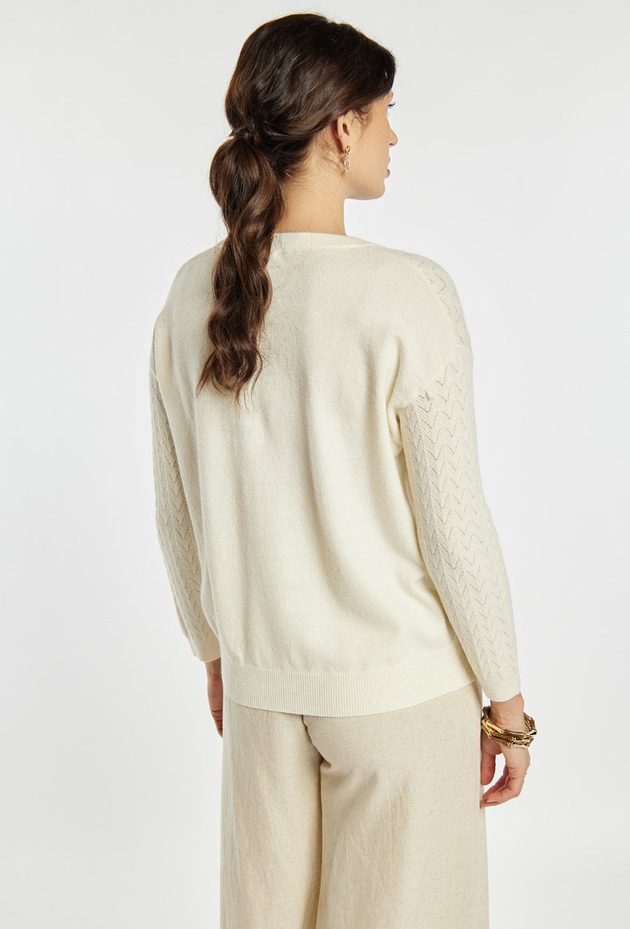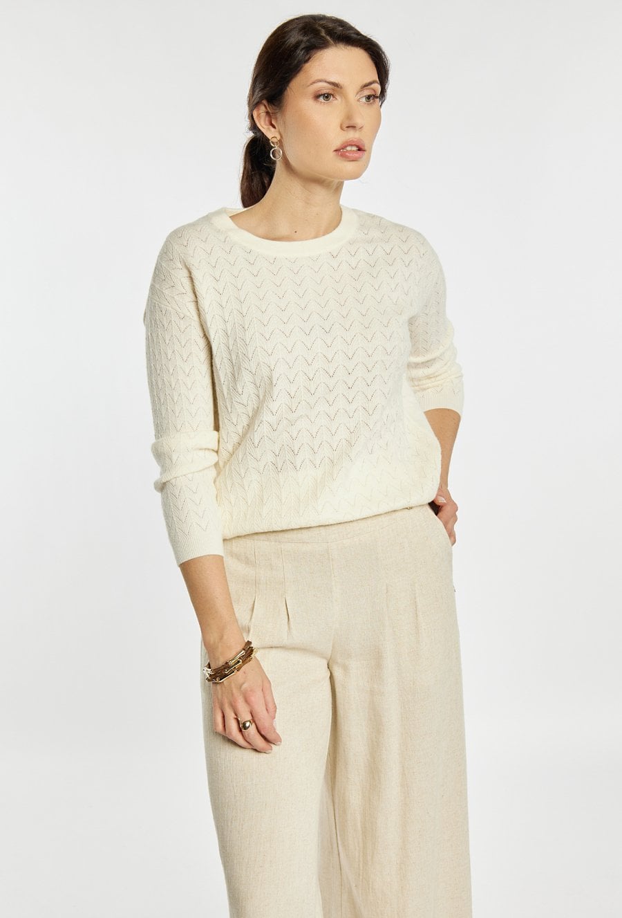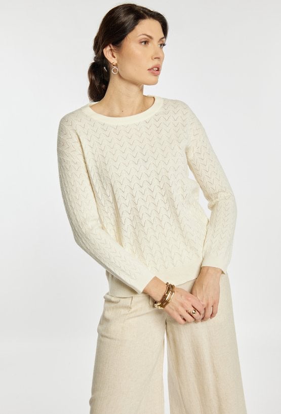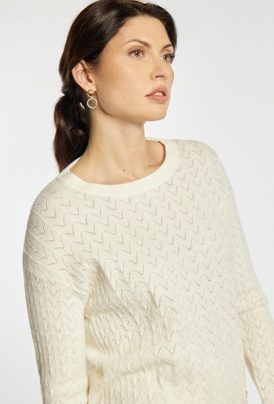 Sweter damski o klasycznym, ponadczasowym kroju. Model z długim rękawem oraz półokrągłym dekoltem. Delikatny, ażurowy splot w pionowe wzory nadaje całości subtelnego i eleganckiego charakteru. Damski sweter doskonale sprawdzi się w codziennych oraz bardziej stylowych stylizacjach. Modelka na zdjęciu ma 177 cm wzrostu i prezentuje rozmiar S/M.