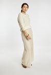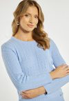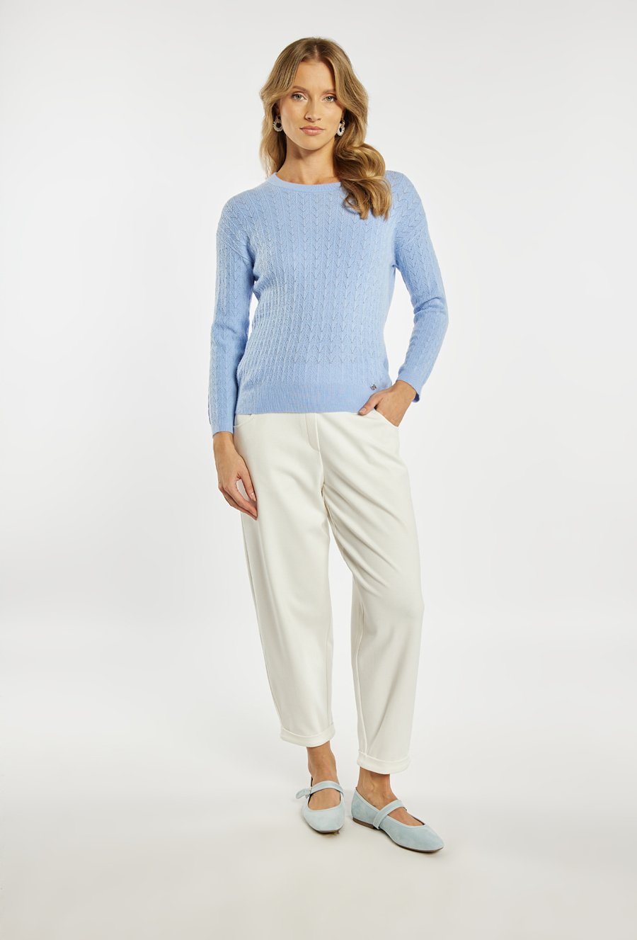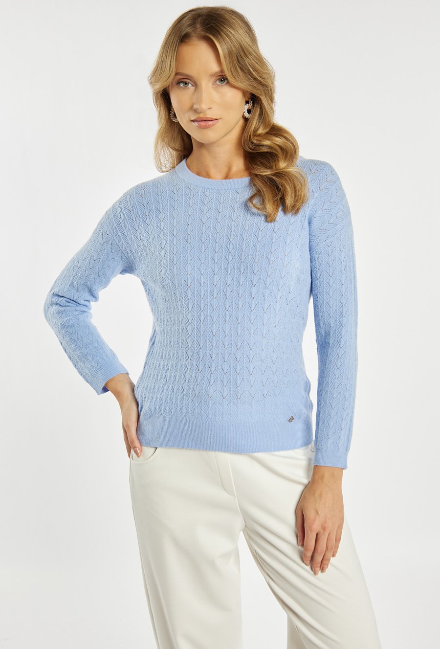 Sweter damski o klasycznym, ponadczasowym kroju. Model z długim rękawem oraz półokrągłym dekoltem. Delikatny, ażurowy splot w pionowe wzory nadaje całości subtelnego i eleganckiego charakteru. Damski sweter doskonale sprawdzi się w codziennych oraz bardziej stylowych stylizacjach. Modelka na zdjęciu ma 177 cm wzrostu i prezentuje rozmiar S/M.
