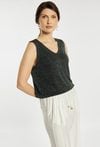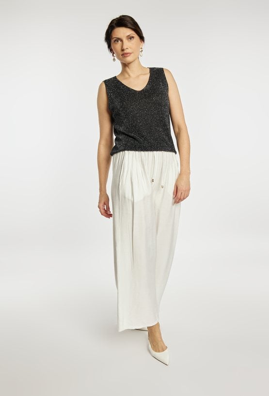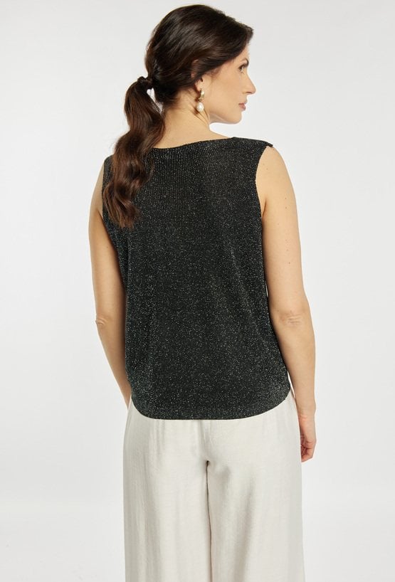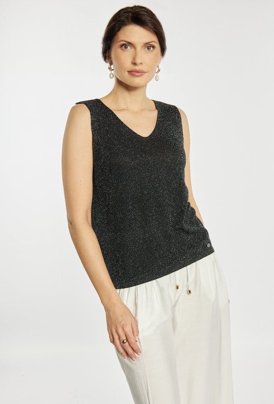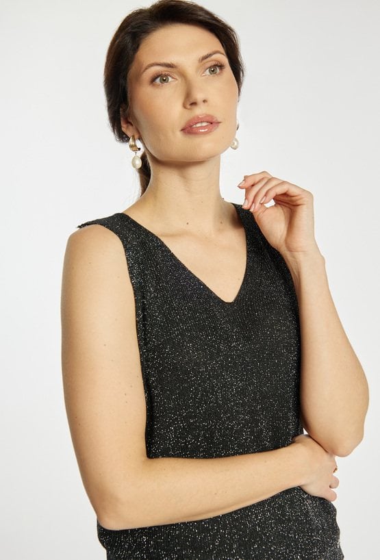Stylowy top sweterkowy damski o luźnym kroju bez rękawów. Model z dekoltem w kształcie litery V oraz delikatnie połyskującą strukturą, która nadaje całości eleganckiego charakteru. Top doskonale sprawdzi się w codziennych i wieczorowych stylizacjach, jako samodzielny element lub warstwa pod marynarkę. Modelka na zdjęciu ma 177 cm wzrostu i prezentuje rozmiar S/M.