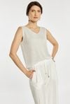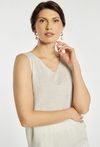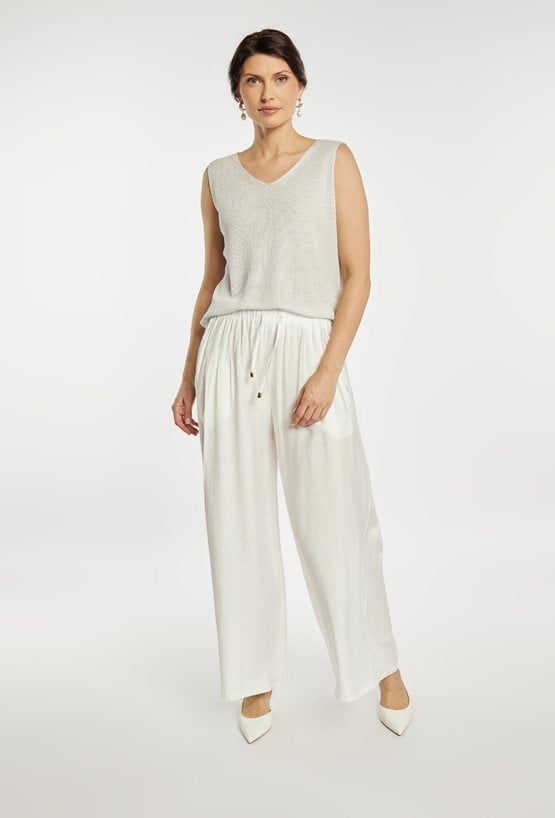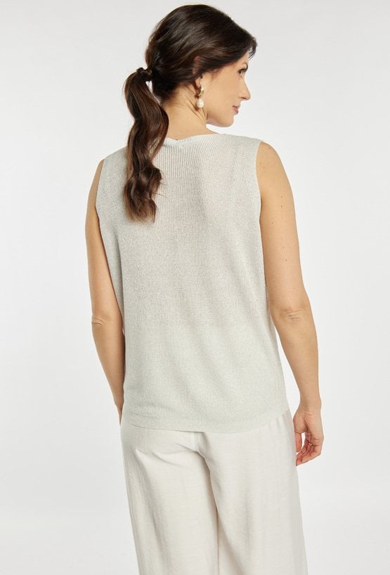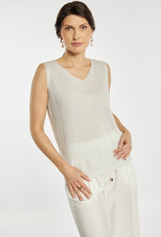 Stylowy top sweterkowy damski o luźnym kroju bez rękawów. Model z dekoltem w kształcie litery V oraz delikatnie połyskującą strukturą, która nadaje całości eleganckiego charakteru. Top doskonale sprawdzi się w codziennych i wieczorowych stylizacjach, jako samodzielny element lub warstwa pod marynarkę. Modelka na zdjęciu ma 177 cm wzrostu i prezentuje rozmiar S/M.