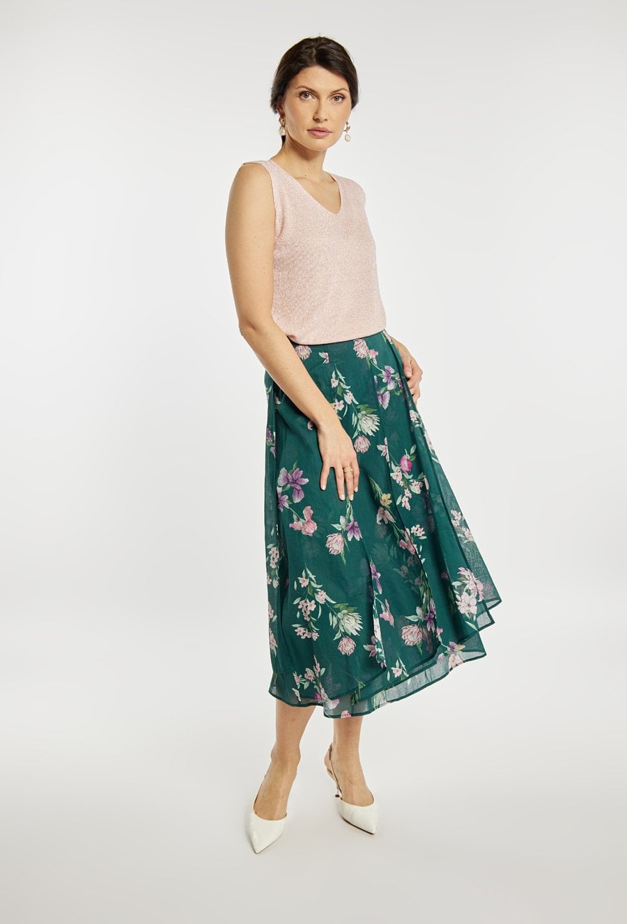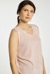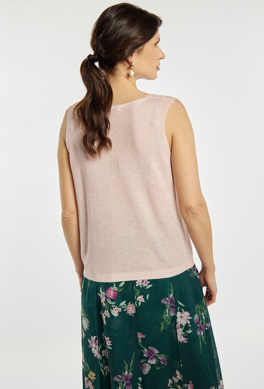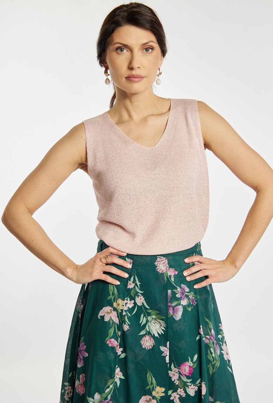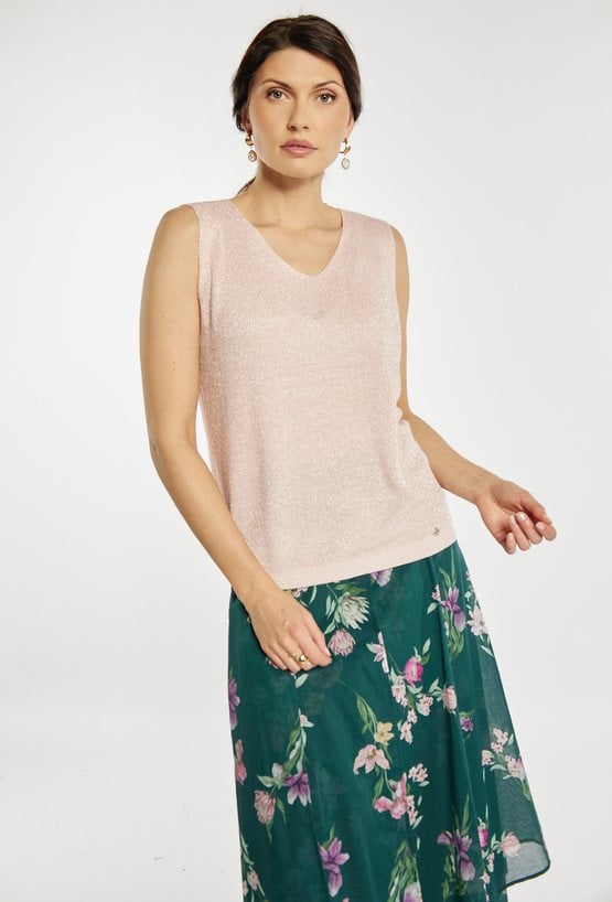Stylowy top sweterkowy damski o luźnym kroju bez rękawów. Model z dekoltem w kształcie litery V oraz delikatnie połyskującą strukturą, która nadaje całości eleganckiego charakteru. Top doskonale sprawdzi się w codziennych i wieczorowych stylizacjach, jako samodzielny element lub warstwa pod marynarkę. Modelka na zdjęciu ma 177 cm wzrostu i prezentuje rozmiar S/M.