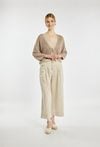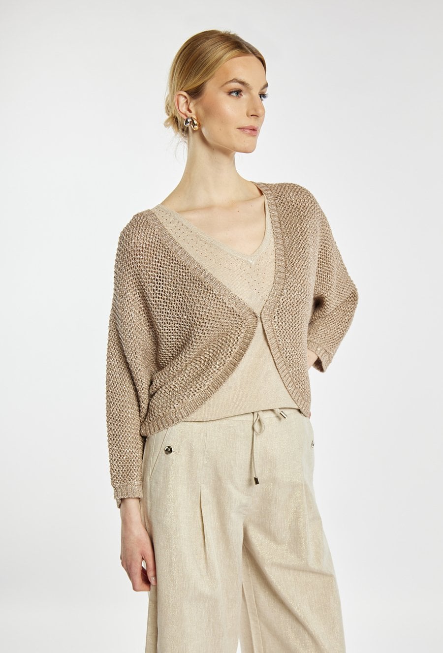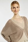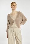 Sweter damski typu bolerko o luźnym, swobodnym kroju z rękawem o długości 3/4. Model z dekoltem w kształcie litery V oraz krótszym fasonem, który doskonale komponuje się z topami i sukienkami. Idealny jako stylowe uzupełnienie codziennych i bardziej eleganckich stylizacji. Modelka na zdjęciu ma 177 cm wzrostu i prezentuje rozmiar S.