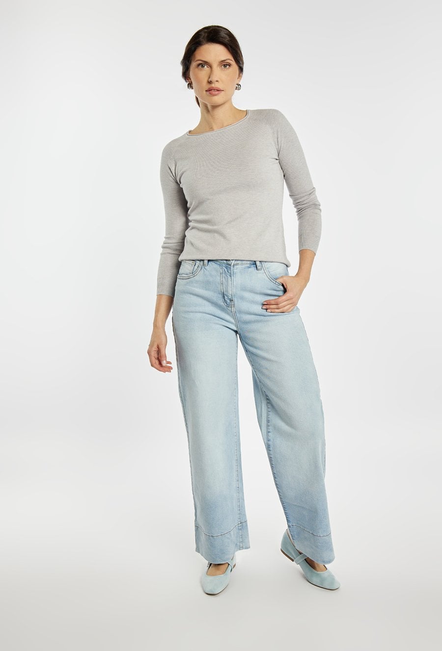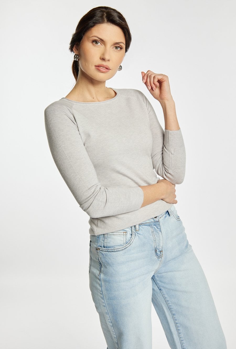 Stylowy sweter damski o klasycznym kroju z długim rękawem. Model z okrągłym dekoltem oraz minimalistycznym wykończeniem, który sprawdzi się w wielu stylizacjach. Sweter zapewnia komfort noszenia i doskonale pasuje do codziennych oraz eleganckich zestawów. Modelka na zdjęciu ma 177 cm wzrostu i prezentuje rozmiar S/M.